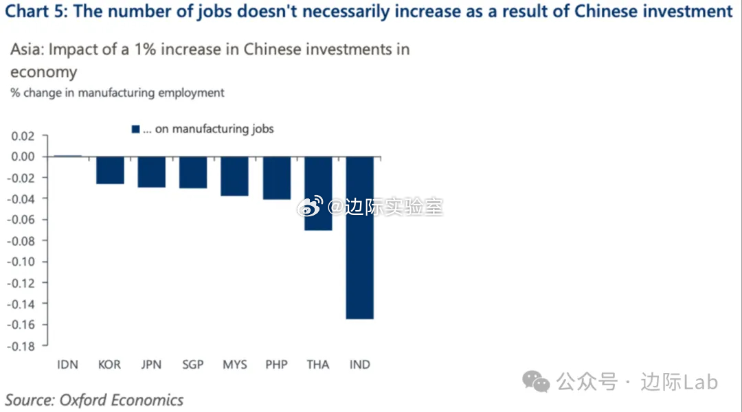 尽管中国的投资能提升东道国的产业复杂度,但其对制造业就业的直接拉动作用却普遍为负,呈现出非对称性影响。数据显示,中国投资每增加1%,印度的制造业就业将收缩超过0.15%,其他如韩国、日本、新加坡等经济体也呈现不同程度的负相关。这反映出,中国投资带来的技术和资本密集型生产模式,在提升生产效率的同时,也在一定程度上替代了亚洲其他经济体本地的劳动密集型岗位,导致整体制造业就业并未随投资同步增长。