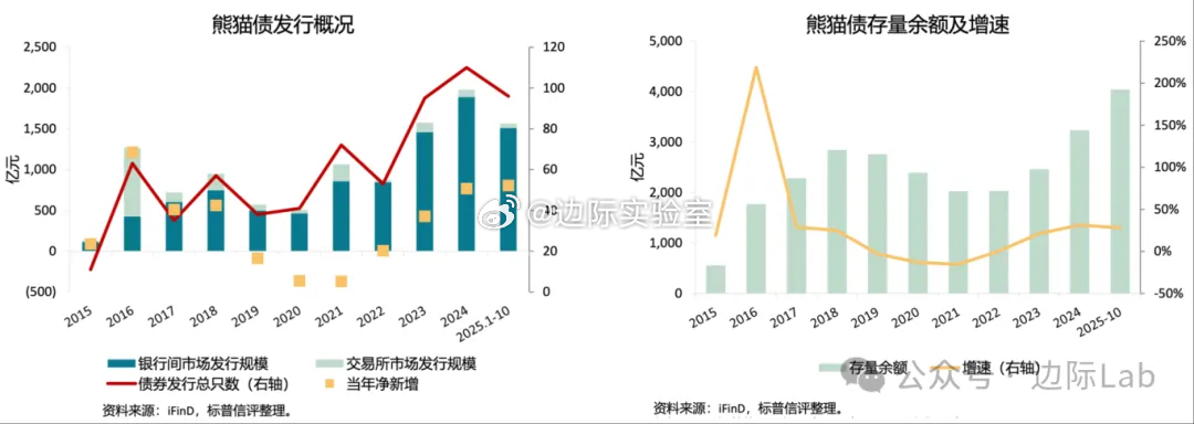 中国熊猫债市场自2023年起快速扩容,并在2024年创下发行量历史新高,全年共发行110只债券,募集资金达1978亿元。受此驱动,2024年末熊猫债存量规模增至3230亿元,并首次超越日本武士债。进入2025年,尽管发行节奏因外部环境影响有所放缓,截至10月末累计募集1564亿元,同比减少13.6%,但市场净融资额已超过去年同期,推动存量余额持续攀升,反映出境外发行人对人民币资产的长期信心未减,市场深度与广度仍在持续拓展。