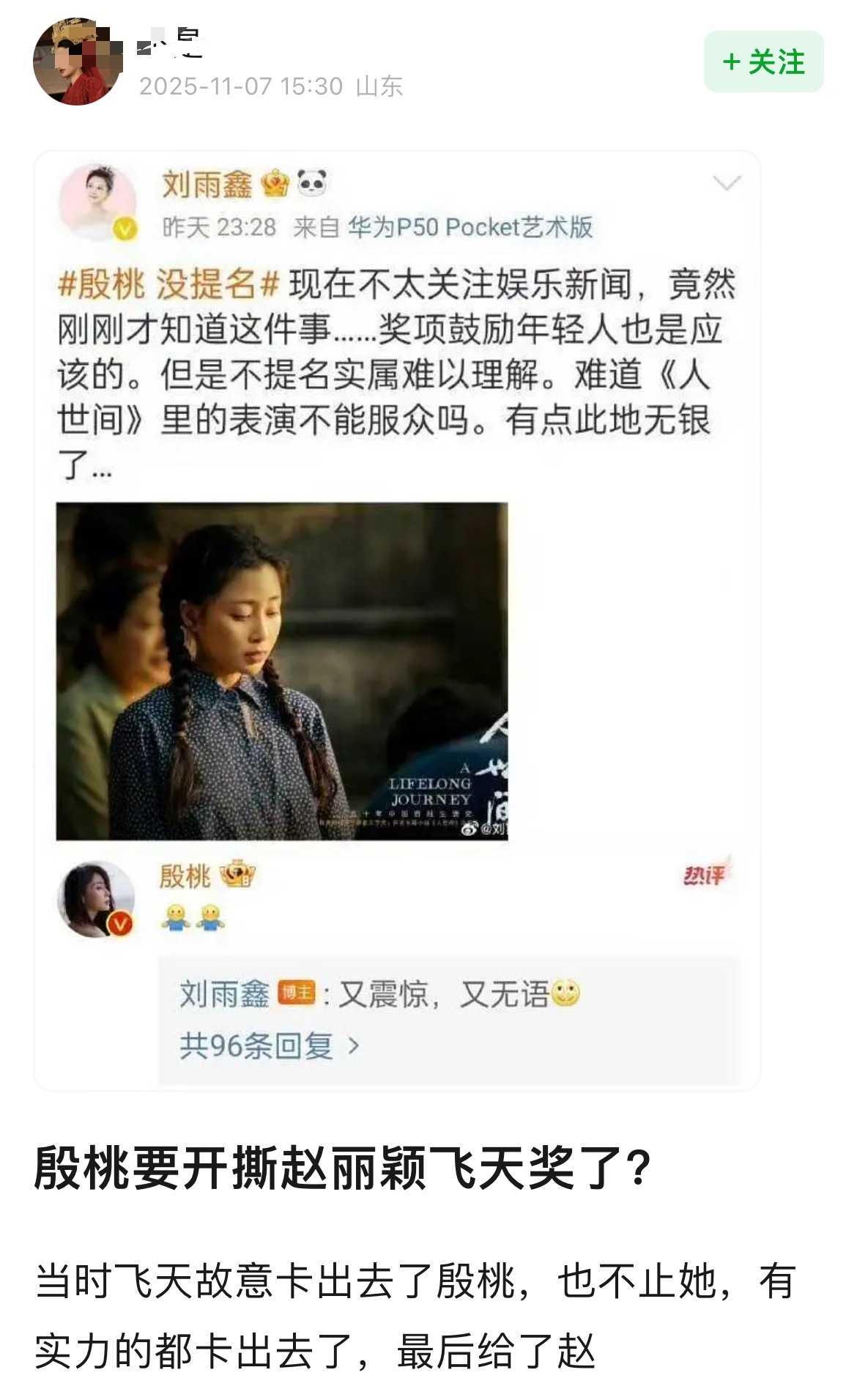 刷到网友:殷桃要开撕赵丽颖飞天奖了?不可能吧,但是殷桃有点倒霉,鸡毛飞上天也被坑了