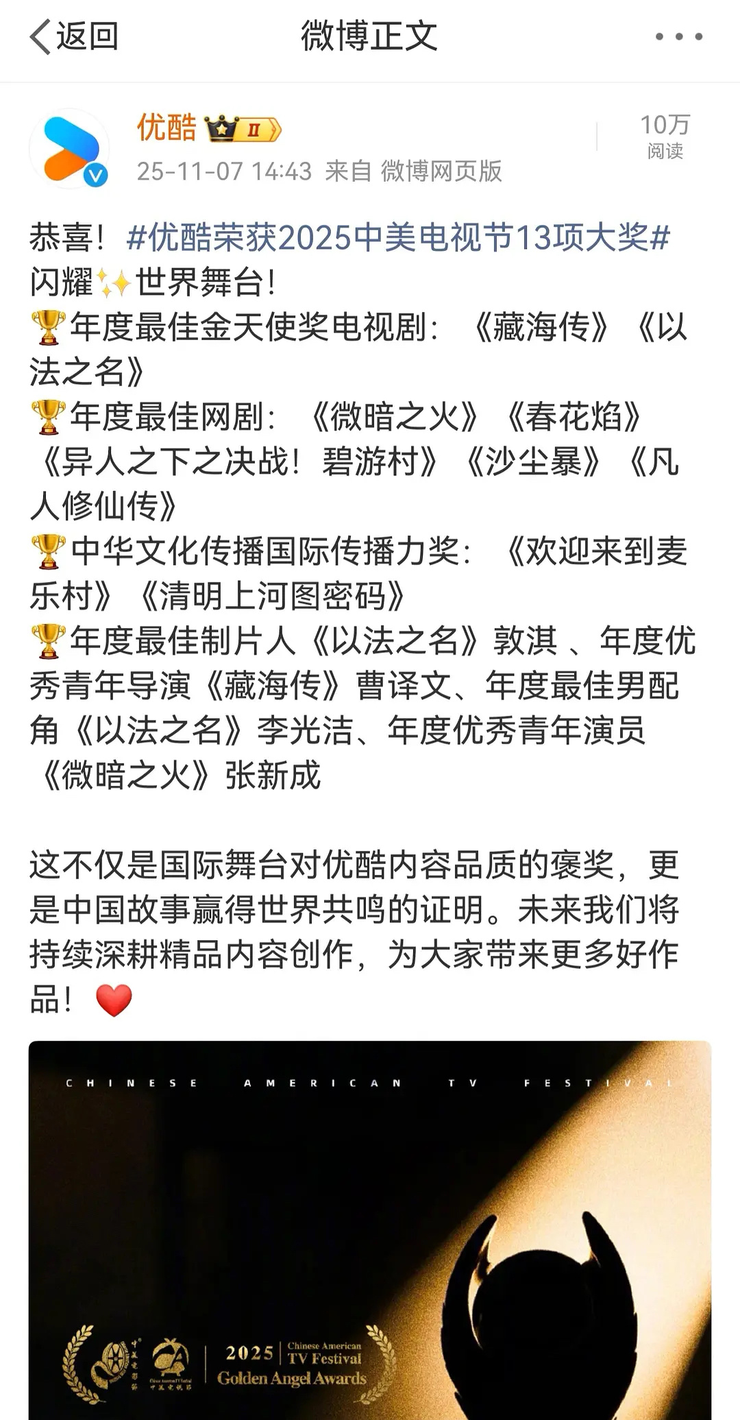 刘学义的春花焰也得奖了,学义刚凭《念无双》拿了文荣奖视帝,春花焰也得了中美金天使奖