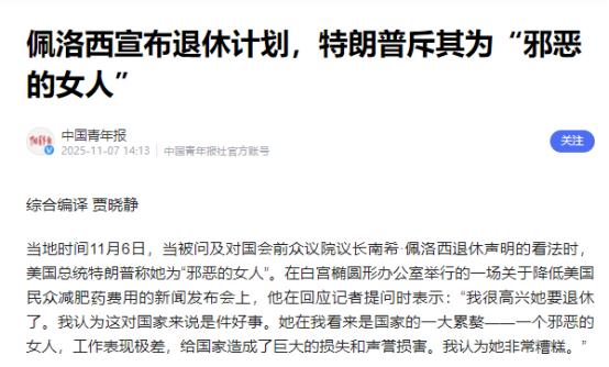佩洛西宣布退休计划,特朗普斥其为“邪恶的女人” 当地时间11月6日,当被问及对国会前众议院议长南希·佩洛西退休声明的看法时,美国总统特朗普称她为“邪恶的女人”。 他不止说佩洛西邪恶,还强调自己特别高兴对方退休。他认为这事儿对美国是大好事,直言佩洛西一直是国家的巨大负担,工作表现极差,还给国家造成了损失和声誉损害。 佩洛西当天通过一段视频宣布了退休计划。这位政客明确表示,不会参加2026年的国会连任竞选,将在2027年本届任期结束后正式退休。 自1987年首次当选联邦众议员以来,她在国会已经待了近40年,还在2007年成为美国历史上首位女性众议院议长。 而俩人的矛盾在2019年彻底公开化,当年,佩洛西主导了针对特朗普的第一次弹劾,指控他滥用职权。 这场弹劾最终在参议院被否决,但双方的敌意彻底摆上了台面。紧接着在2020年的国情咨文现场,特朗普拒绝与佩洛西握手,佩洛西直接当众撕毁了他的演讲稿,这一幕成了美国政治史上的名场面。 2021年1月6日的国会山骚乱事件,让两人的对抗达到顶峰。骚乱发生时,佩洛西被迫撤离国会大厦,她的办公室被洗劫一空,名字甚至被列入暴徒的“处决名单”。事后,佩洛西再次主导弹劾特朗普,指控他煽动暴力,可惜这次弹劾依旧没能成功。 当然佩洛西对特朗普的评价也没客气过,她曾公开骂特朗普是“卑鄙的家伙”,称他是“地球上最糟糕的人”。她多次强调,特朗普根本不尊重宪法,还把最高法院变成了“流氓法院”。就在近期的采访里,她还在毫不留情地回击特朗普。 所以显而易见特朗普对佩洛西的攻击早就不是新鲜事了。2024年竞选期间,他就在集会上频繁抨击佩洛西,一会儿说她不正直,一会儿骂她病态。到了11月7日,特朗普和匈牙利总理欧尔班共见记者时,又重复了之前的评价。他还加了新说法,指责佩洛西利用职务“发家致富”。 其实佩洛西的退休其实藏着不少无奈,10月5日,她在国会大厦外被追问国会山骚乱的责任时,情绪直接失控,对着记者大喊“闭嘴”,最后得靠助手搀扶才站稳。这一幕让外界明显感觉到,这位曾经的政坛女强人已经显露疲态。 民主党内部的压力也让她难以支撑。她曾力挺哈里斯接替拜登参选,结果哈里斯在2024年大选中惨败给特朗普,这让她得罪了不少党内势力。加上共和党重新掌控国会,特朗普又卷土重来,她继续留任很可能面临更多调查和攻击。 这位任职近40年的老牌政客,终究还是要告别国会。她的退休不仅是个人政治生涯的落幕,也被视作美国一代政治精英的集体退场。而特朗普那句“邪恶的女人”,不过是两人多年激烈对抗的又一个注脚罢了。 来源:中国青年网 【佩洛西宣布退休计划,特朗普斥其为“邪恶的女人”】