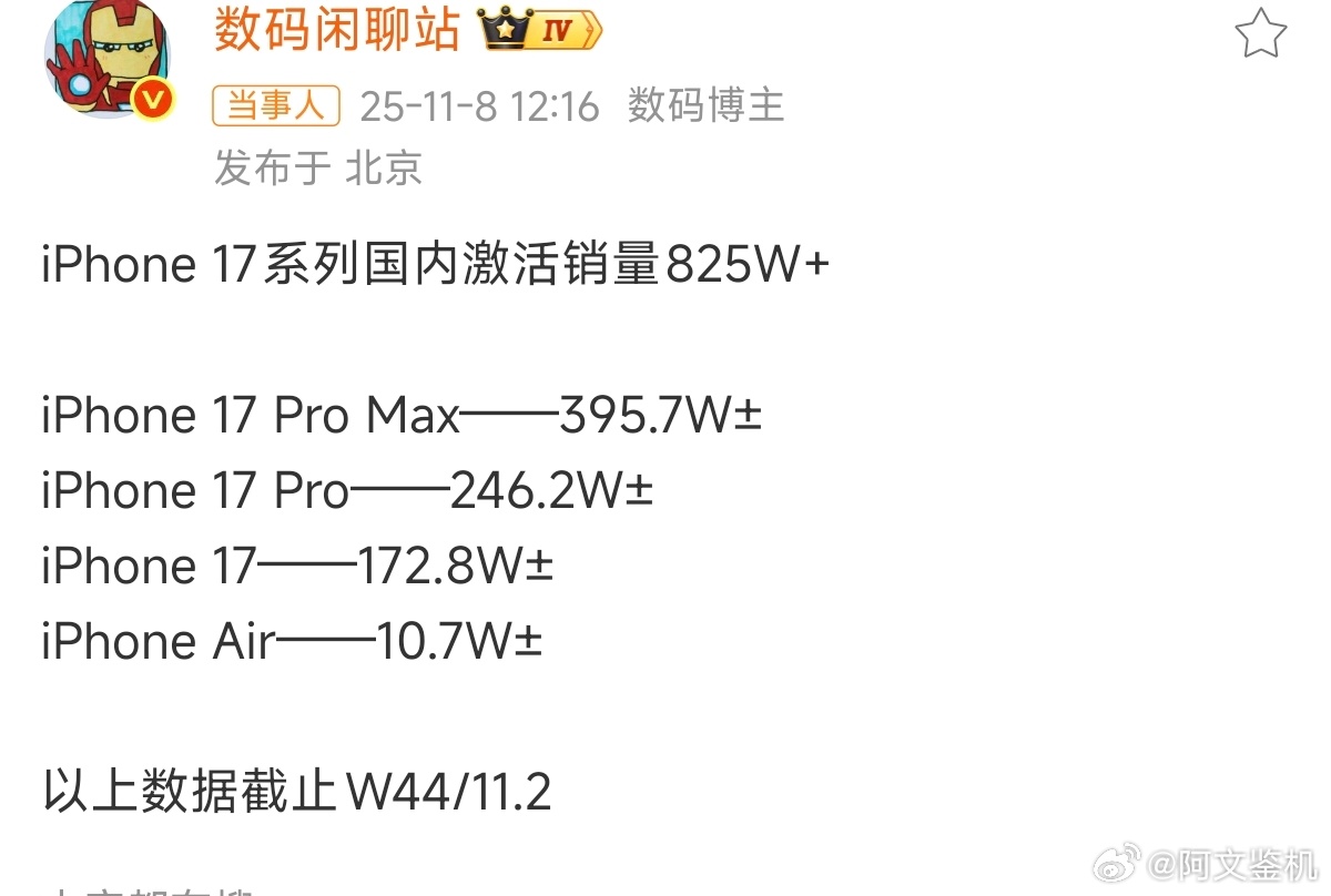 iPhone17系列国内激活销量果子的统治力确实一个能打的都没有,51天国内iPhone 17系列激活量800多万,勉强能够得到苹果尾巴的就小米17系列了,激活量突破200万,其他的都是50万以下,不要说其他手机卖的时间不长,首销销量爆发一波,后面平销期销量都不会太好。所以苹果的统治力真没话说,太强了。