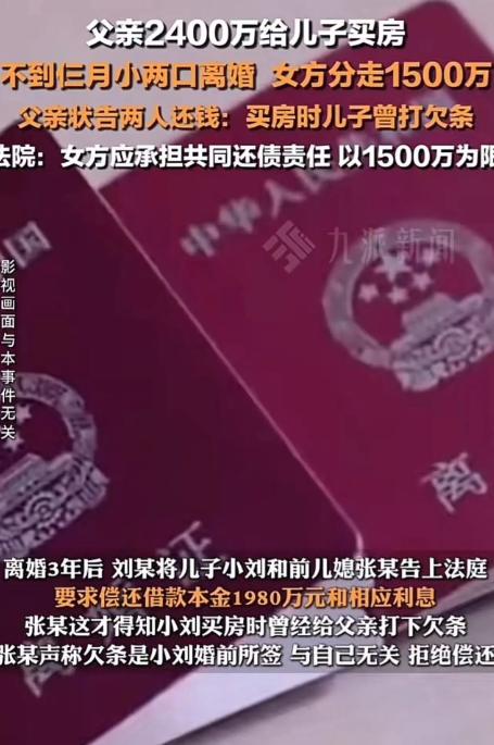 “姜还是老的辣!”4月9日报道,上海一位父亲花2400万给儿子买婚房,3个月不到小两口就离婚,女方分走1500万!但父亲技高一筹,买房时留了一手,状告两人还钱!法院:女方应承担共同还债责任,以1500万为限! 2025年上海某法院,女方接过判决书手发抖:刚分的 1500 万婚房财产,竟要全拿去还 2400 万借款,一分没剩。 她这时才懂,孙父当初买房时让儿子签《借款协议》,不是多此一举,而是早留的后手,让她措手不及。 时间拉回两人结婚前一个月,孙父坐在办公室翻购房合同,建筑生意多年的谨慎让他没直接掏钱。 他叫来儿子:“这 2400 万算你借我的,签个协议,免得以后有麻烦。” 孙先生虽不解,但还是照做了。 孙父特意让财务在转账时备注 “借款用于购房”,还将协议和转账凭证锁进保险柜,这些细节后来成了关键证据。 另一边,女方正忙着选婚礼场地,以为孙父全款买房是对她的认可,从没想过财产背后藏着法律约定。 婚后第 2 个月,小两口开始频繁吵架,女方觉得孙先生事事听父亲的,没主见;孙先生觉得女方太计较。 第 3 个月,女方提出离婚,态度坚决,还提出要分割婚房 —— 她认为这是婚后共同财产,该得一半。 孙先生找父亲商量,孙父没慌,只说:“按流程走,别忘了咱们签的协议。” 随后让律师准备材料。 离婚协议签订时,女方顺利分到 1500 万房产折价,她以为这事就结束了,没想到半个月后收到法院传票。 法庭上,女方律师称 2400 万是孙父对儿子的赠与,不属于债务,可孙父律师当场拿出《借款协议》。 协议上明确写着 “借款 2400 万用于购买婚房,还款期限为婚姻存续期间或离婚后一年内”,签字日期是婚前一周。 律师还提交了银行流水,转账备注 “借款” 与协议日期对应,甚至有孙父和儿子讨论还款的聊天记录。 女方这才想起,婚前孙先生提过 “买房钱是家里借的”,她当时没在意,以为是随口说说,没放心里。 法院审理后认定:《借款协议》合法有效,购房款属夫妻共同债务,女方需按分得财产比例偿债。 判决下来,女方不仅没拿到钱,还得配合办理财产过户用于还债,她后悔当初没看清财产性质就离婚。 事件传开后,孙父的朋友都夸他 “有远见”,他却只是说:“我不是算计,是不想家里辛苦钱打水漂。” 孙先生后来重新投入工作,他说这段经历让他明白,婚姻里不仅有感情,还要把财产问题说清楚。 女方则很少再提这段婚姻,据说她后来咨询了律师,了解到婚前财产约定的重要性,也算是吸取了教训。 如今,那套婚房已被挂牌出售,售价刚好覆盖 2400 万借款,孙父收回了钱,没让家里有太大损失。 周边邻居提起这事,有人说孙父太理性,也有人说换做谁都会这么做,毕竟 2400 万不是小数目。 这件事也成了小区里的 “普法案例”,不少准备结婚的年轻人,都会主动咨询婚前财产如何约定。 律师们也常拿这个案例提醒客户:感情再好,涉及大额财产时,白纸黑字的约定才是最稳妥的保障。 没有狗血的争执,也没有激烈的对抗,这场财产纠纷最终以法律判决收尾,留给大家的是更多关于婚姻与财产的思考。 信息来源 :九派新闻 父亲2400万给儿子买房 不到仨月小两口离婚 文方分走1500万 父亲状告两人还钱:买房时儿子曾打欠条 法院:女方应承担共同还债责任 以1500万为限