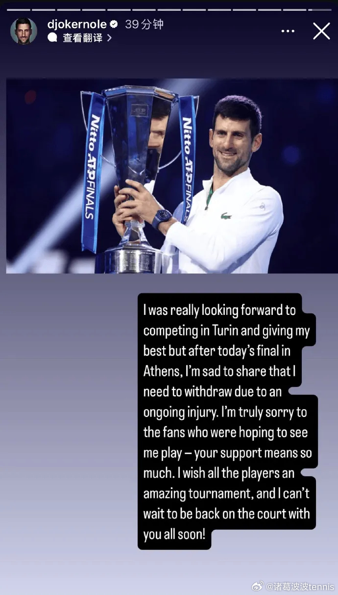 德约科维奇在社媒中写道:“我真的非常期待以最好的状态去都灵参赛,但今天雅典夺冠后,我不得不遗憾地宣布因为伤势退赛。很抱歉想来看我打球的粉丝们,你们的支持对我来说意义非凡。我希望选手能打出一站精彩的比赛,期待我能很快重返赛场。”