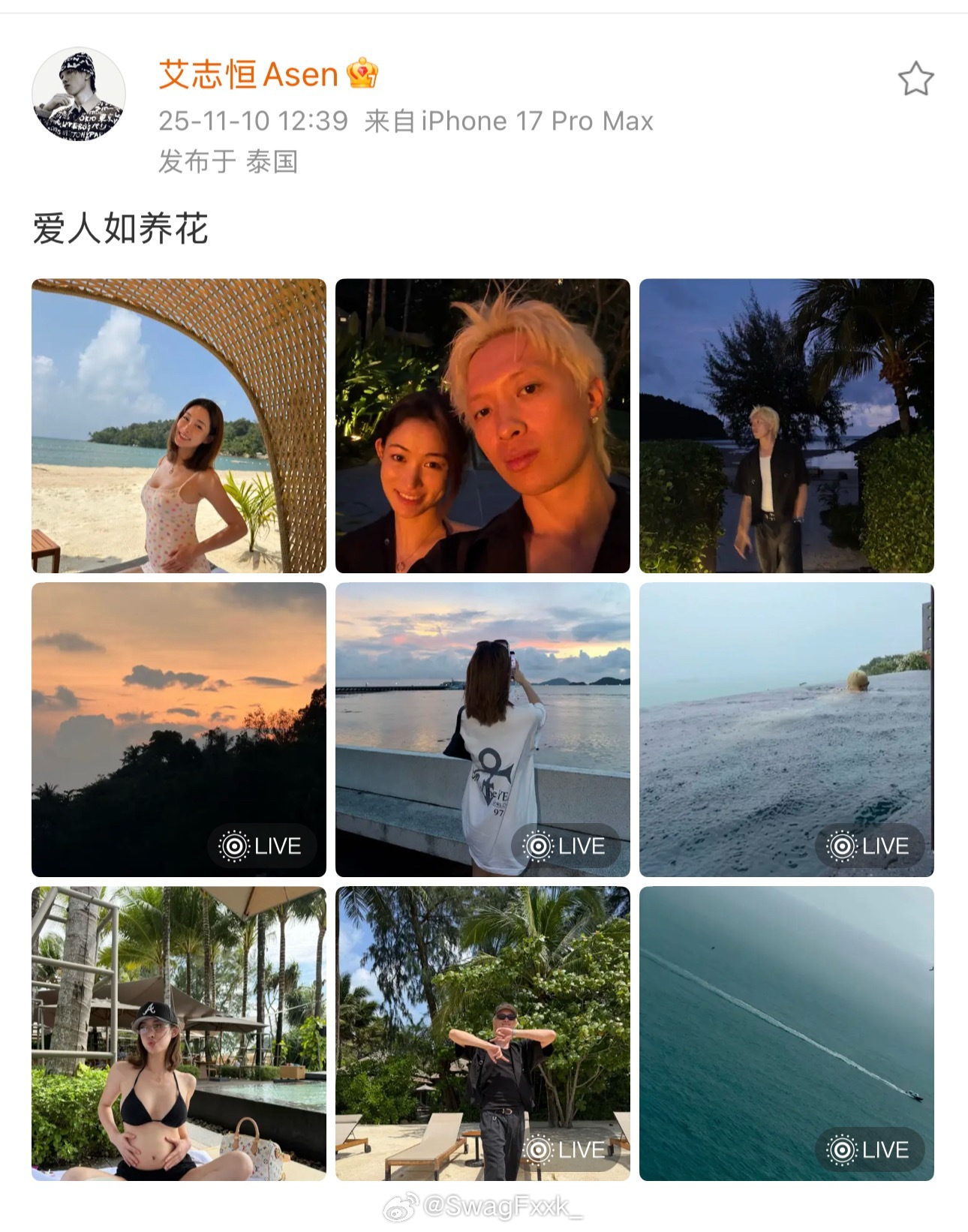 Asen更新动态秀恩爱啦:爱人如养花[心]Asen艾志恒
