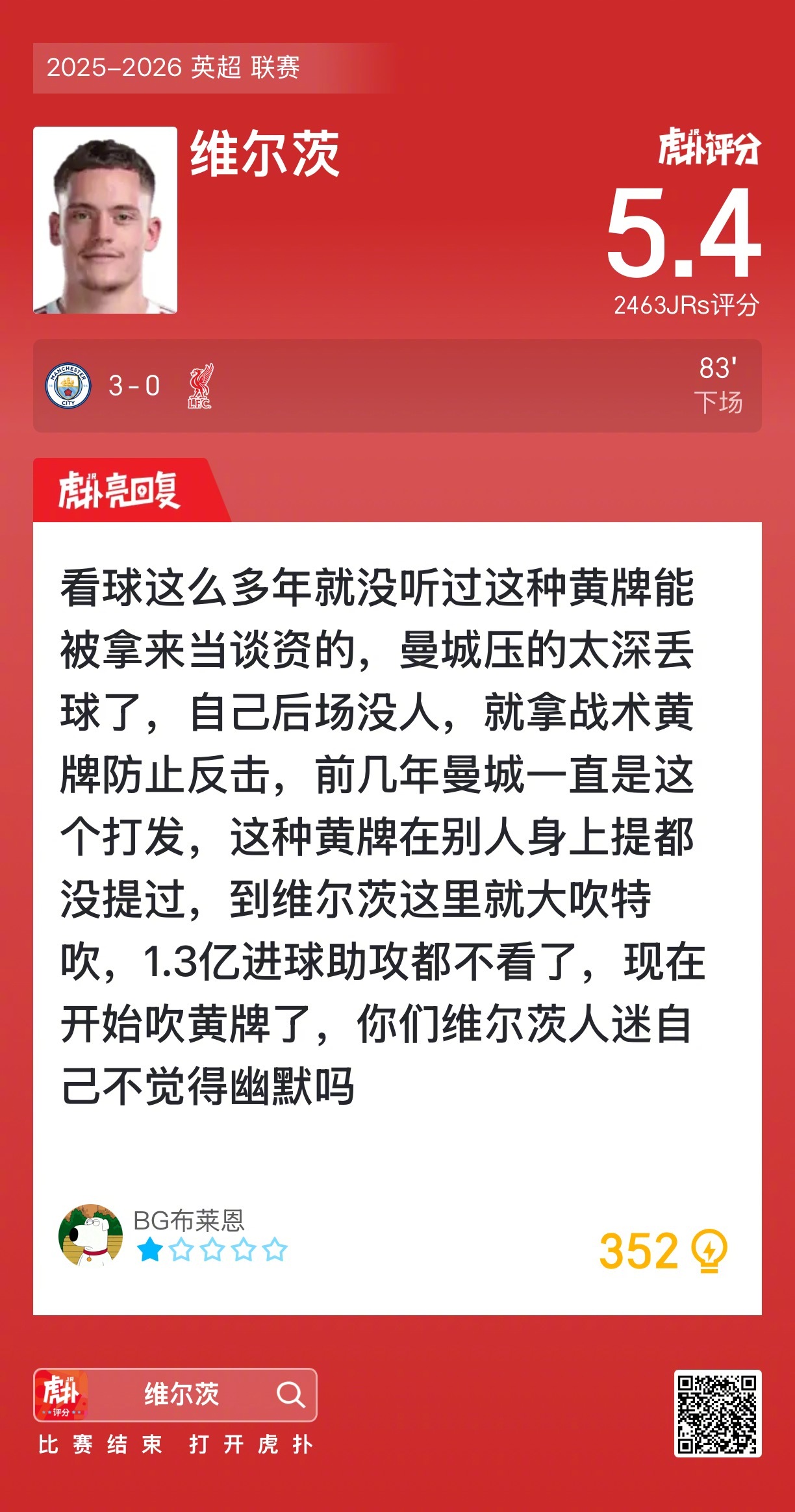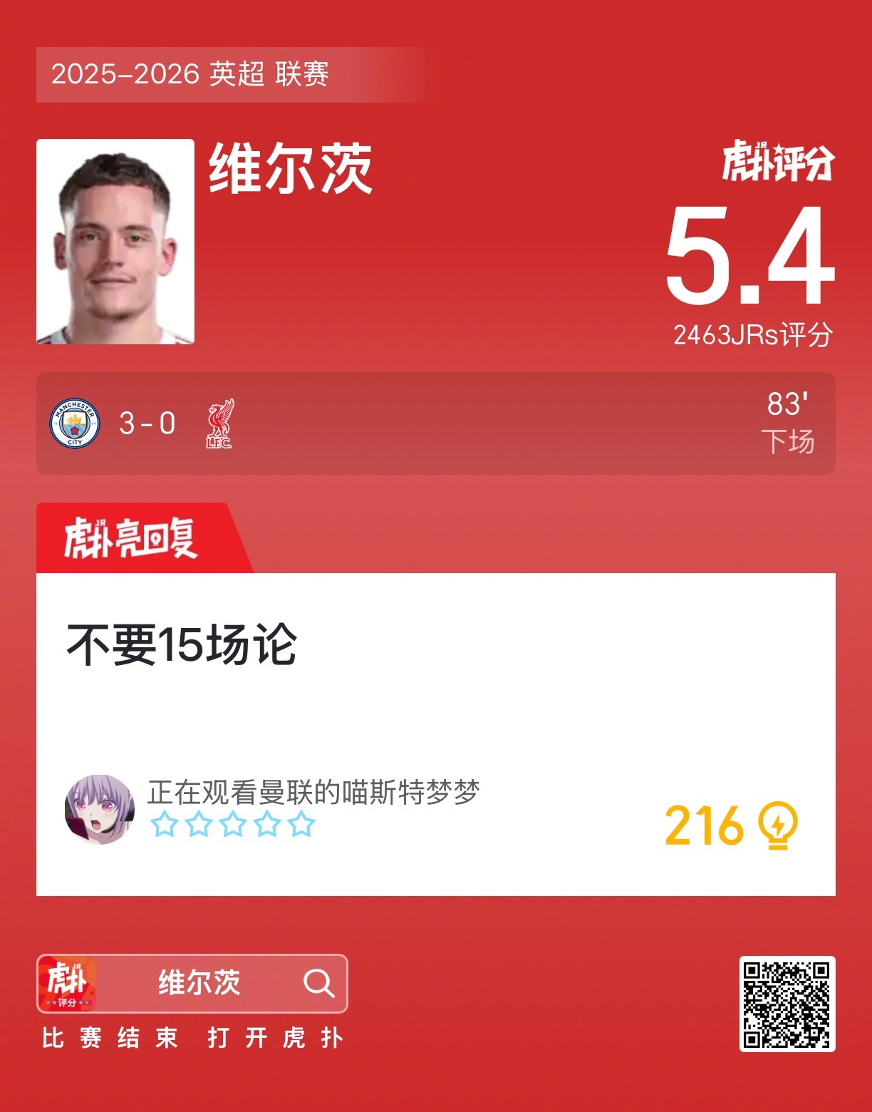 曼城3比0利物浦 维尔茨赛后收获5.4的虎扑评分!
