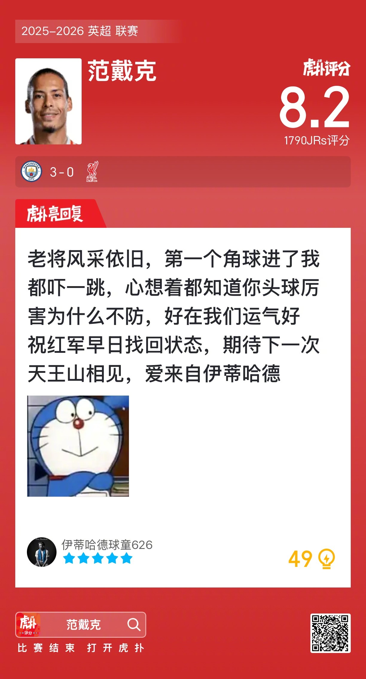 曼城3比0利物浦范戴克赛后收获8.2的虎扑评分!