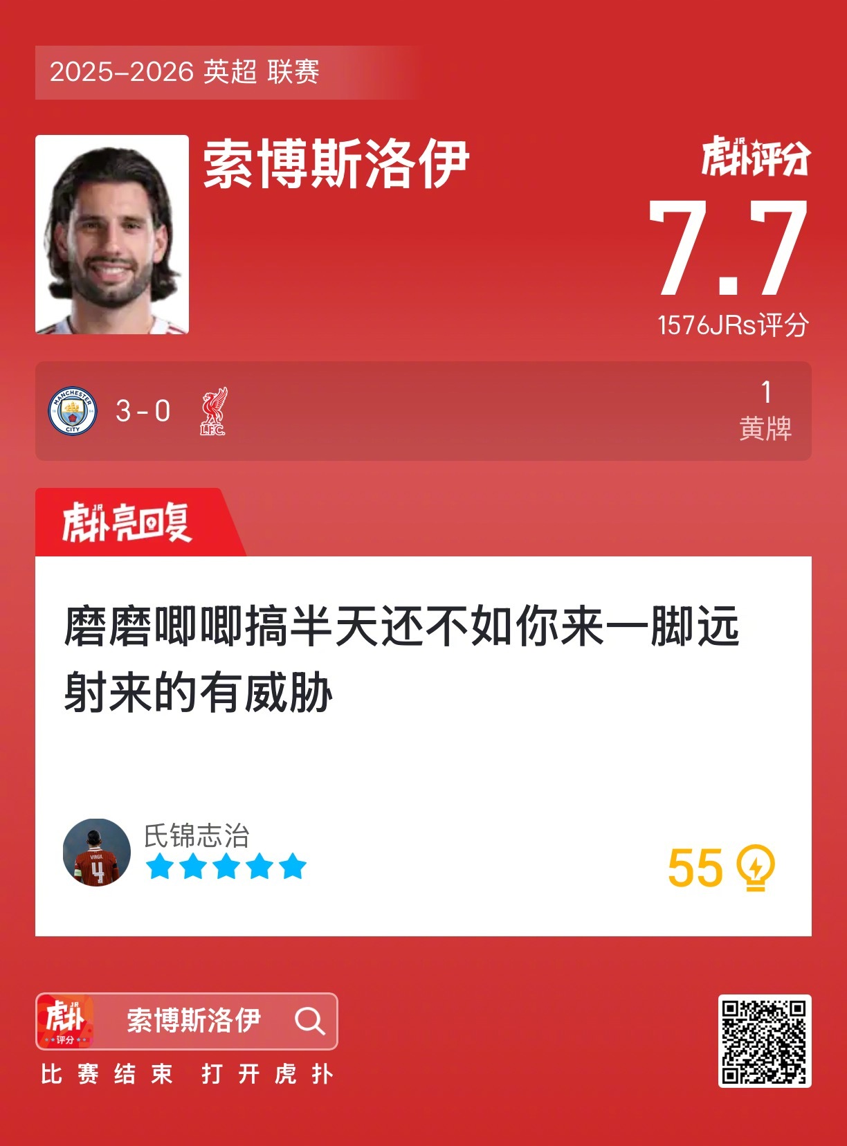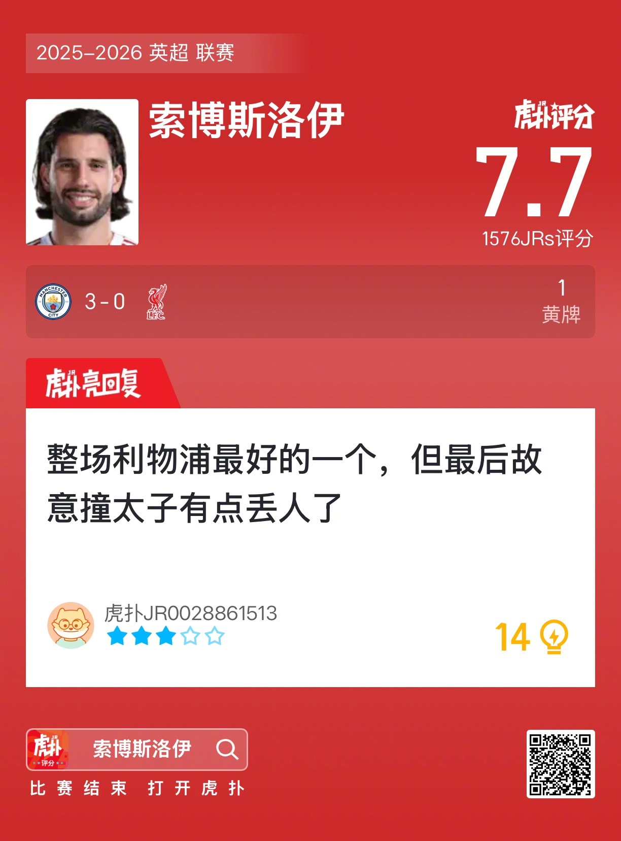 曼城3比0利物浦索伯斯洛伊赛后收获7.7的虎扑评分!