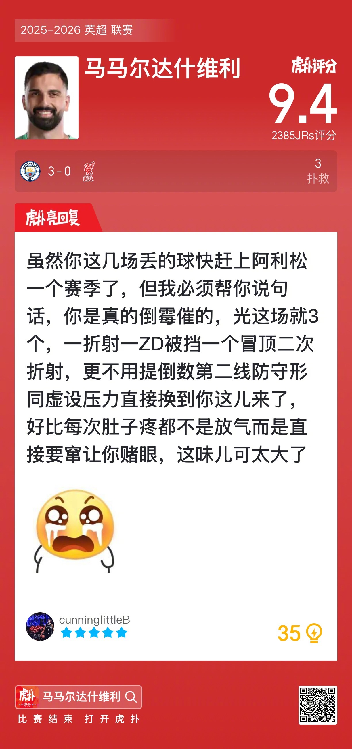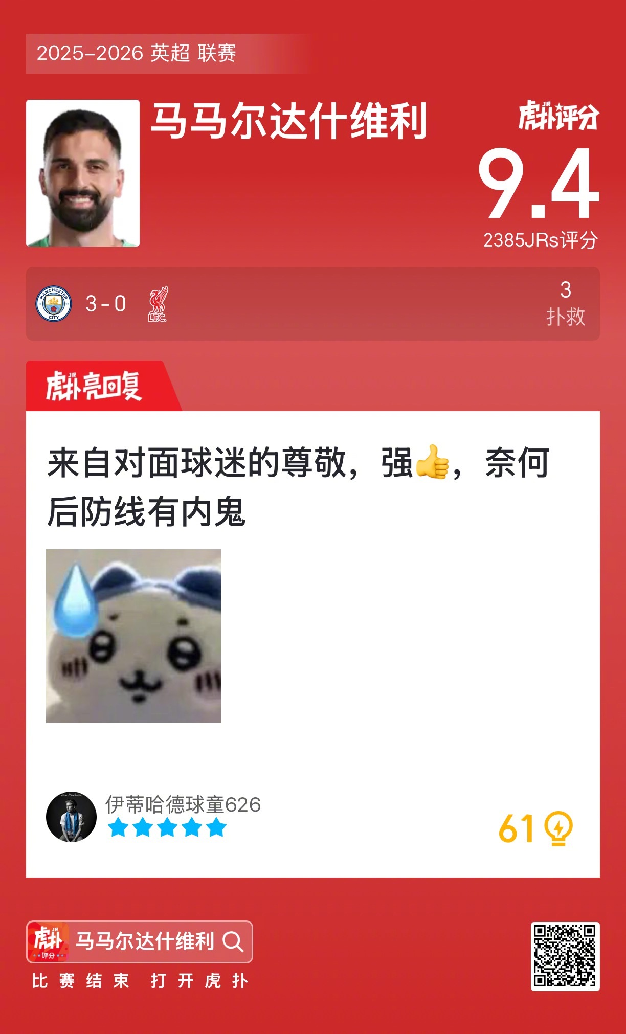 曼城3比0利物浦马马尔达什维利贡献三次扑救,赛后收获9.4的虎扑评分!