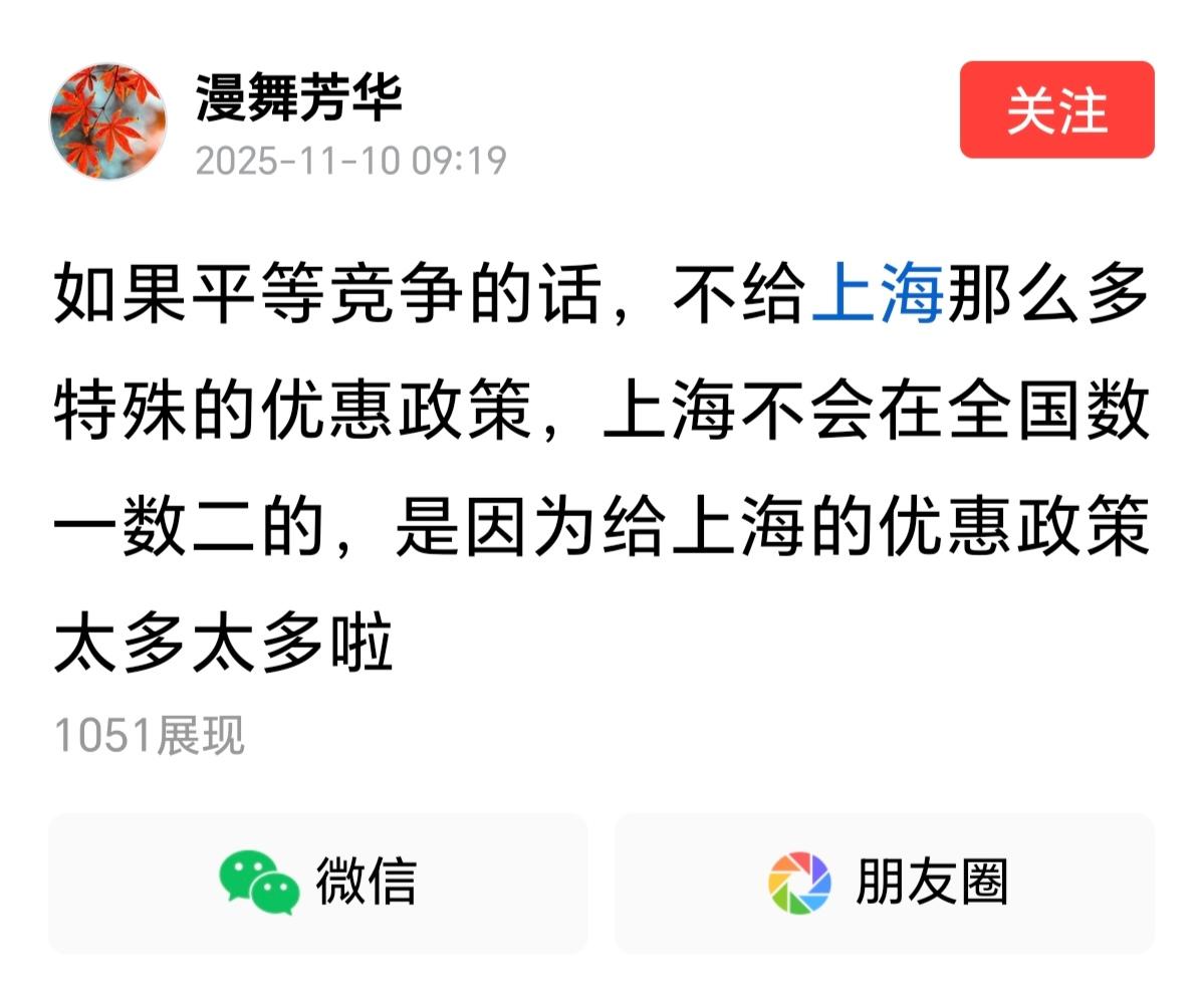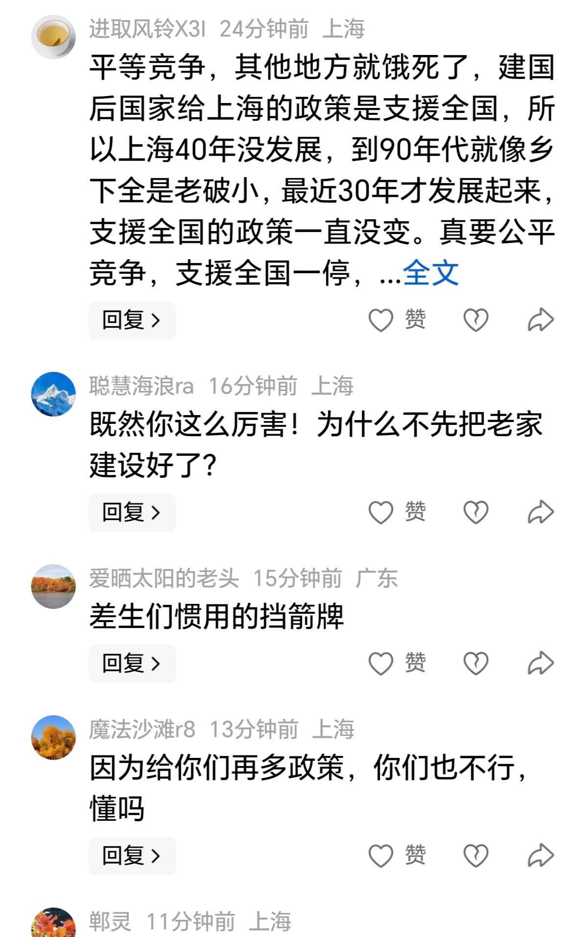 好多条友认为国家投资上海,给上海的政策,项目感觉不公平,如果投资到其他地方,同样也能产生效果,然而,事实真的是这样吗? 国家投资1个亿,你认为分别投到江西,上海,分别产生什么样的结果?授之以渔,授之以鱼,哪个效果更好。你生活贫困,人家送给你鱼,你吃个三五天,就吃完了了,然后继续伸手要鱼,如果人家也没鱼了,你就会饿死。然而,教你如何捕鱼,你既便没人送鱼给你,你也全用学到的捕鱼方式自己捕鱼,至少饿不死。这就是现实。投到上海的一个亿,三五年后,能回报国家三五个亿,同时给周边地区带来1000个就业机会。而投到江西,经过三级领导(省,地区,县)的层层剥离(财政支出),剩下30%,扶贫,第二年,继续申请,二个亿。永无止境。八十年代,我去江苏乡下,冬天一大群老少爷们围在一起聊天,我就说了,有这聊天的时间,为什么不出去打工赚钱?也能见见外面的世界。他们说,打工多累啊,晒晒太阳有多好?一天二顿饭。就凭这种思想觉悟,国家投资的话最多也就一天二顿饭变成二顿饭,再多加一个菜。难道不是吗?大城市的退休工人为什么有些人还出来干活?目的就是改善生活,而贫困地区的人,五十多岁,就躺平,想着靠儿女养老了。要知道,儿女也有自己的家庭,大部分人收入并不高,有能力给你养老吗?你才五六十岁,需要儿女给你养老吗?