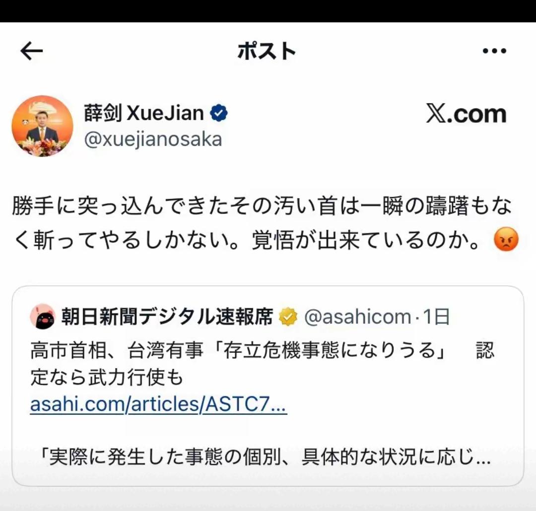 过瘾!外交官的硬气回应,才是对挑衅者最好的“清醒剂”! 日本首相高市早苗公然把“台湾有事”和日本“存亡”绑在一起,还放话要动武,这哪是外交辞令,分明是明火执仗干涉中国内政。台湾是中国的家务事,轮得到战败国指手画脚? 薛剑总领事那句“斩掉擅自闯入的肮脏头颅”,根本不是挑衅,而是底线警告。你都要把手伸进别人家里了,还不许主人家还手?日本网民跳脚叫嚣要驱逐,说白了就是心虚——知道自己理亏,只能靠撒泼转移焦点。 别拿“外交礼仪”当挡箭牌,尊重从来是相互的。你先突破红线挑衅,就别怪我们亮出底线反击。对待这种蹬鼻子上脸的干涉,软言细语没用,就得用他们听得懂的硬气说话。 你觉得这种强硬回应是必要的,还是该更温和沟通?来评论区聊聊你的看法!