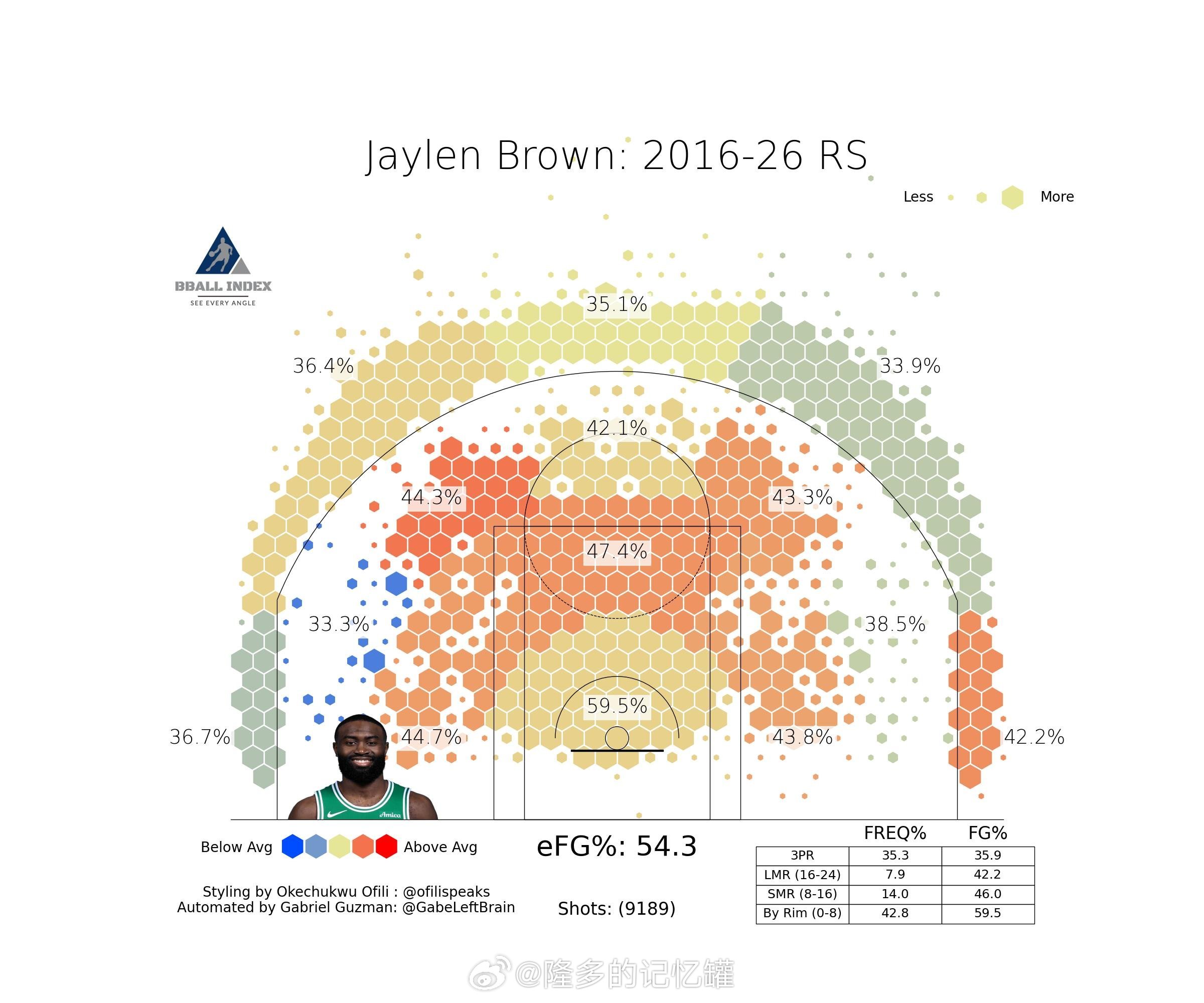 杰伦·布朗职业生涯投篮数据(截至今日):