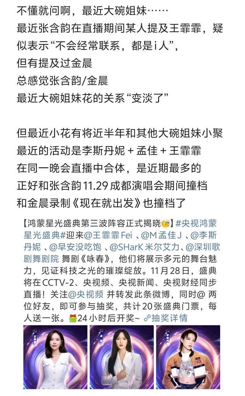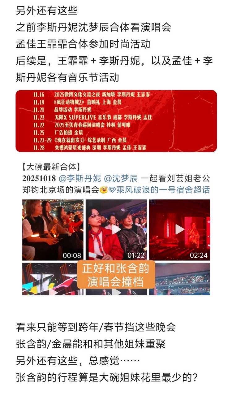 tg最近大碗姐妹花一直是李斯丹妮孟佳王霏霏合体,但张含韵和金晨有近半年没和其他姐妹合体,难道张含韵和别的姐妹可能失去联系了吗?