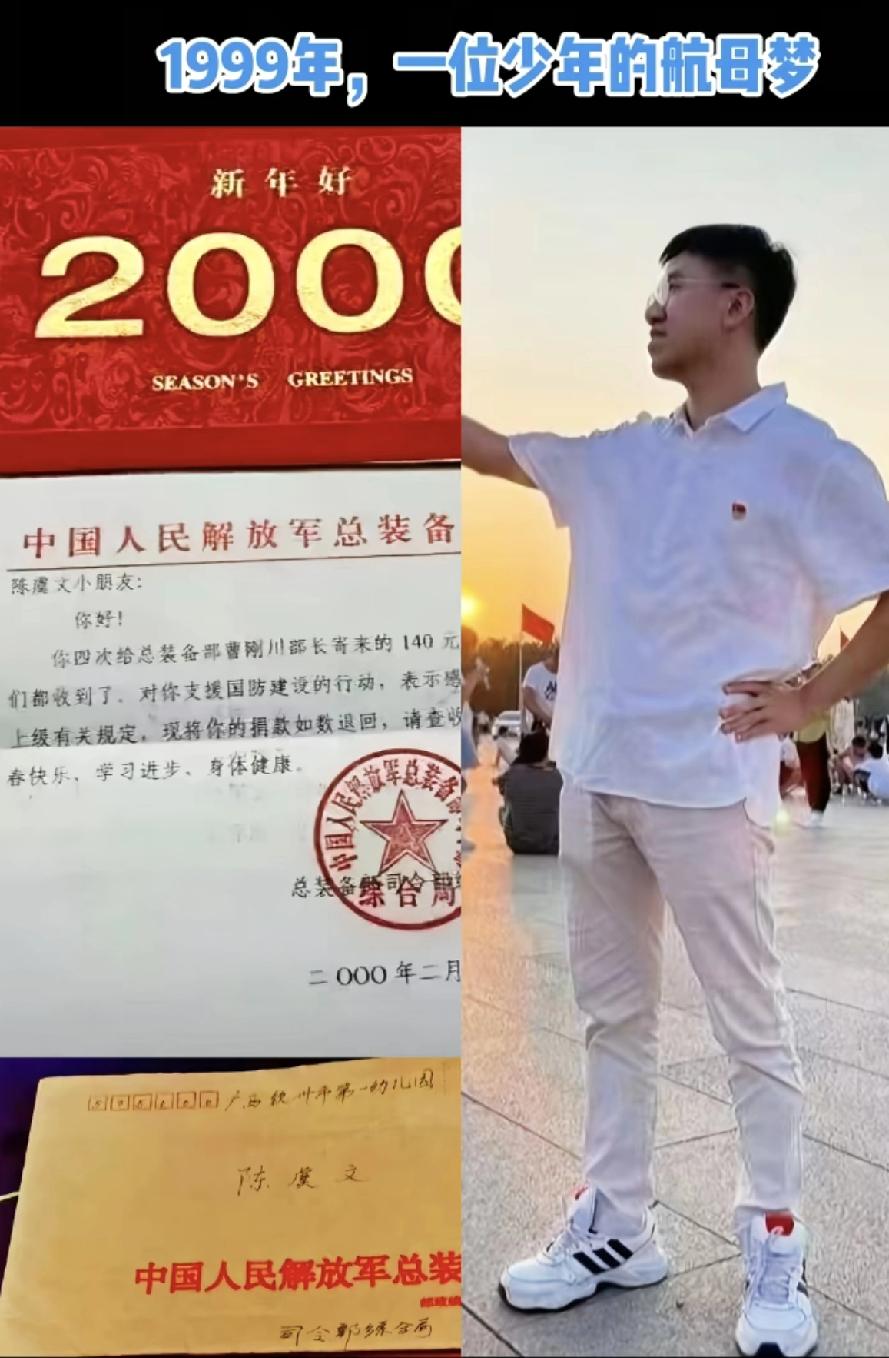 1999年,广西钦州有个叫陈虞文的小男孩,把自己省吃俭用攒下的140块零花钱悄悄寄给了解放军总装备部,说想给熊猫们造一艘航母。没料到钱被退了回来,还跟着一封特别暖心的新年贺卡。 这事儿其实跟他当军人的爸爸脱不了关系。那年北约轰炸中国驻南联盟使馆,电视里那些愤怒又心疼的抗议画面,让他小小的心里种下了一颗种子——“我也要帮祖国!”爸爸不仅没笑他异想天开,反而摸着他的头说:“有这份心就好,我们一起想想办法。”于是父子俩跑了4回邮局,才把那个沉甸甸的信封投进邮筒。 后来总装备部回了信,信里说:“谢谢你想为国防建设出份力,不过规定不允许收,钱得退给你。”虽然钱没留下,但那张印着熊猫图案的贺卡,他一直珍藏着。 如今陈虞文已经长大了,看到山东舰、福建舰一艘艘从海里“钻”出来,他站在海边看新闻时,心里别提多激动了:“小时候那个给熊猫造航母的梦,真的实现了!”大学学的是法学,毕业后却成了个不折不扣的军迷,后来还上了央视的军事节目,跟大家聊装备、讲国防。 有网友留言说:“这就是最动人的传承啊,一个孩子的赤子之心,最后真的成了强军路上的星光。”不知道那张承载着孩子心意的贺卡,他现在还收着吗?或许每个心里装着“中国”的人,都曾是那个想给祖国添砖加瓦的“陈虞文”吧?