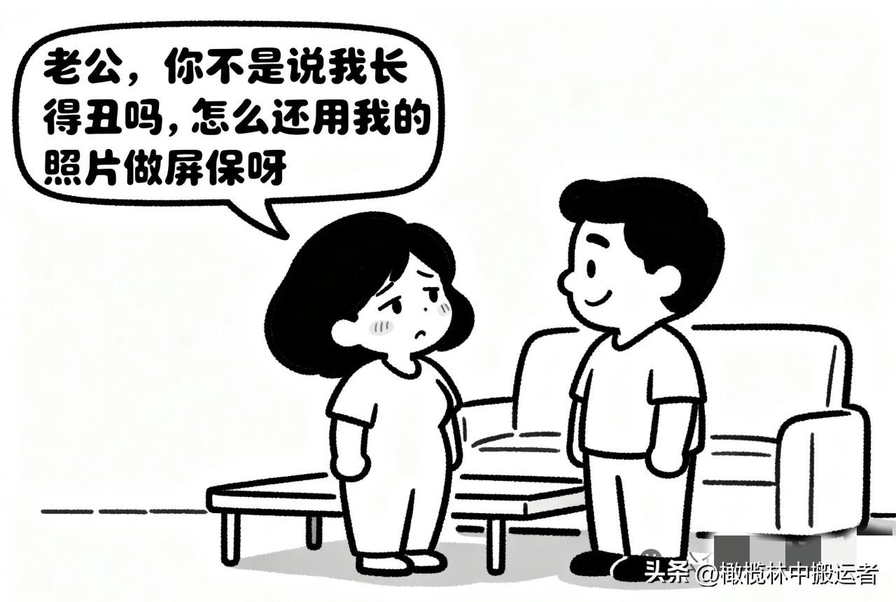 趣味漫画:老婆:老公,你不是说我长得丑吗,怎么还用我的照片做屏保呀?老公:这可真