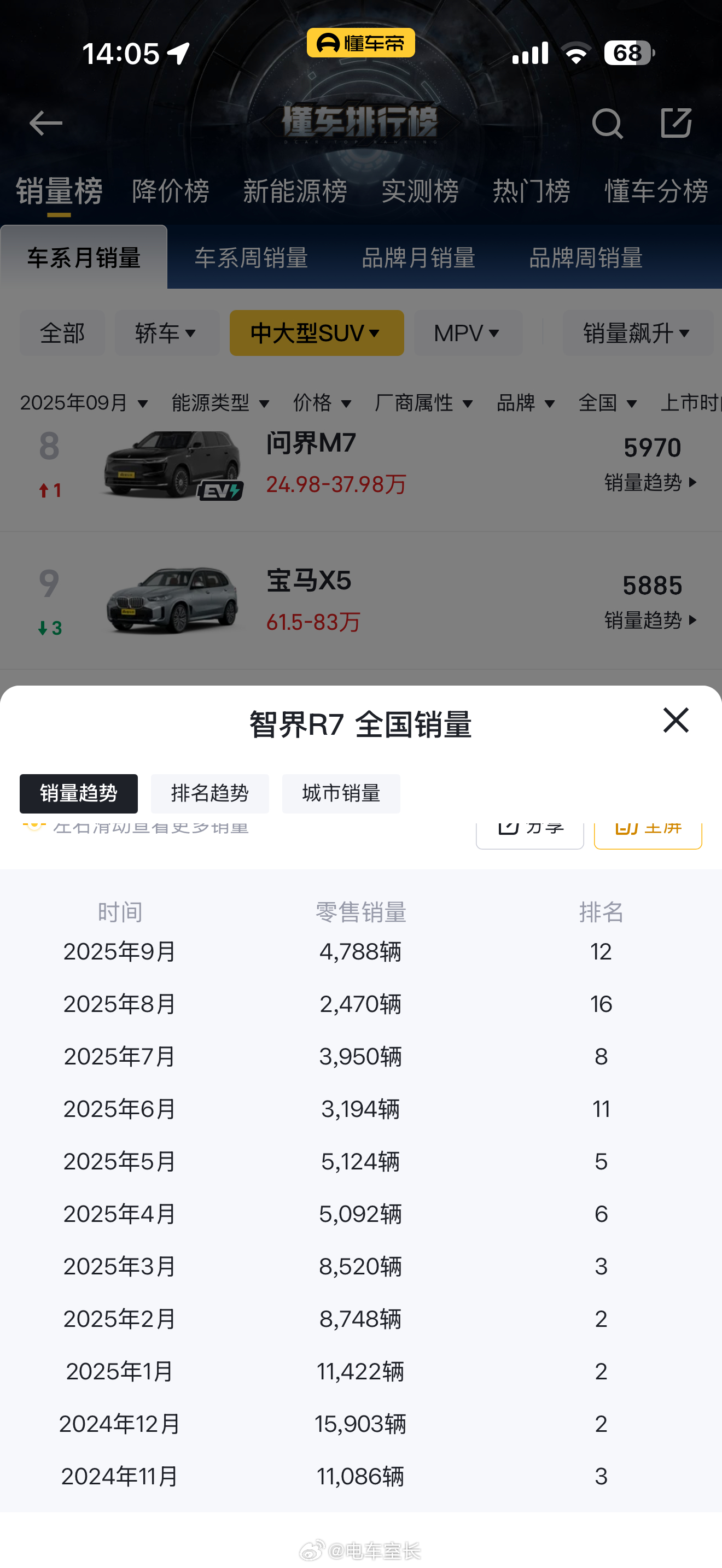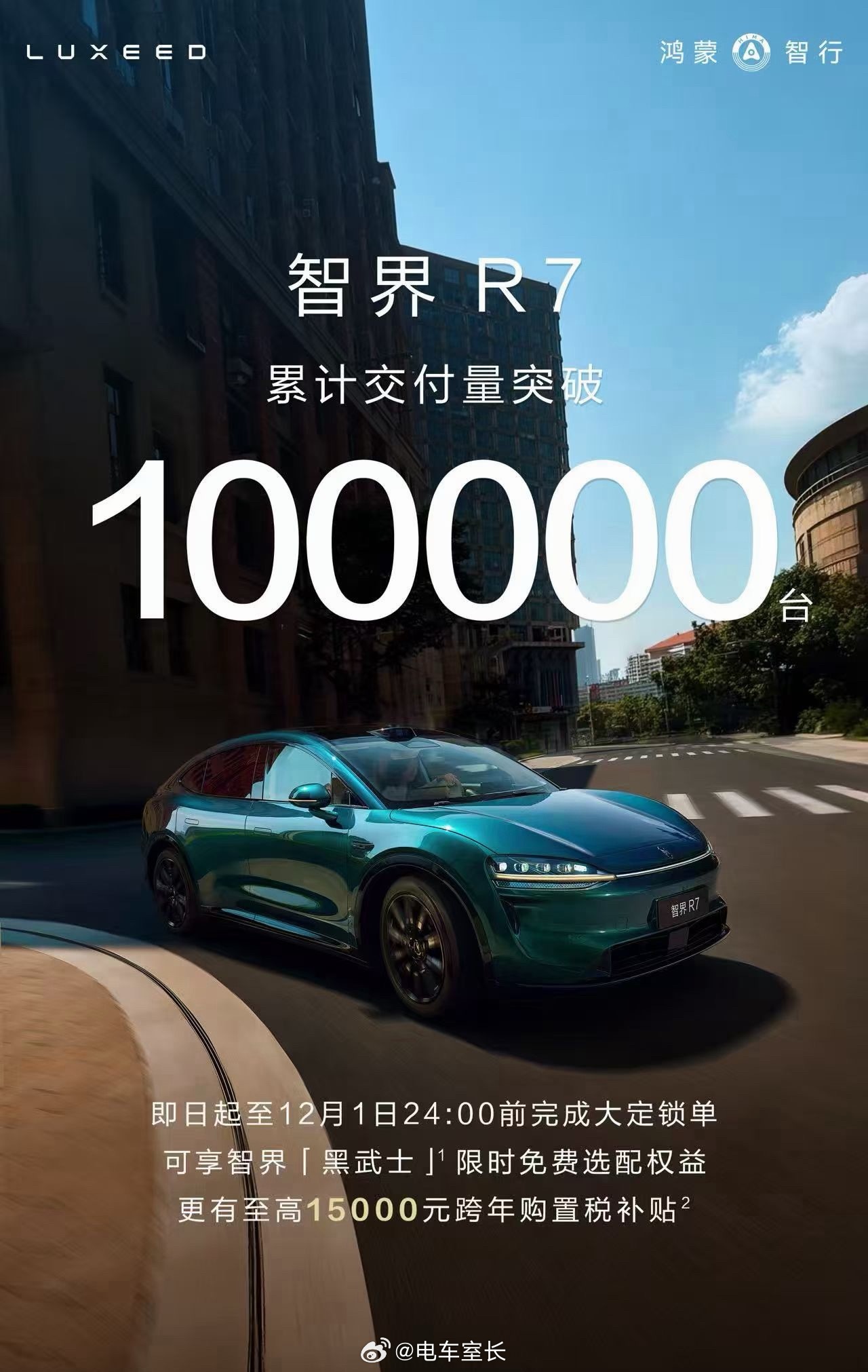 智界R7累计交付量破10万,改款后重新爬坡,现在还有黑武士套装可以免费选。我个人挺喜欢智界的远端仪表屏设计的,不会被方向盘挡住,也不受光线变化影响,开起来也更加运动,是鸿蒙智行里的宝藏车型。