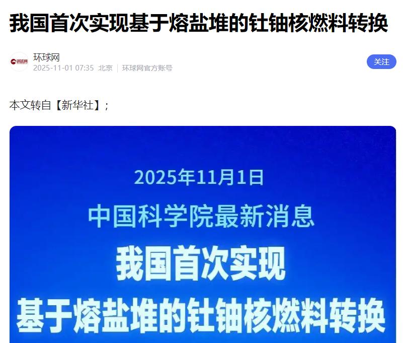 这下出名了!不止中国,连全世界都知道了!11月1日,中国科学院对外证实,由中国科学院上海应用物理研究所牵头打造的2兆瓦液态燃料钍基熔盐实验堆,近期成功完成钍铀核燃料的首次转换。   这座实验堆目前已经默默运行超1000天,从2024年10月首次添加钍燃料到如今完成关键转换,每一步都在创造人类核能史上的新纪录。那么,这技术到底牛在哪呢?   传统核电用的铀-235在天然铀里只占0.7%,挖一堆矿石才能提炼出一点点,还得担心核泄漏和万年都消不掉的废料。   咱们这钍基熔盐堆就不一样了,燃料是钍和熔盐的混合物,像岩浆似的在炉子里燃烧,最绝的是那个被动安全设计——温度一旦超标,底部熔盐会自动凝固流进安全罐,从物理层面杜绝了堆芯熔毁的风险,比传统压水堆的“高压锅”模式安全多了。   更别提钍这东西的储量了,中国光已探明的就有28万吨,占全球23%,排名世界第二,而铀资源才占全球3%,这相当于别人还在为铀矿争破头,我们在稀土堆里就淘出了核燃料。   若是算笔经济账,这玩意儿简直是“白菜价”能源的代名词。   钍本身是稀土开采的副产品,获取成本低到可以忽略不计,现在估算一度电只要0.1元,是燃煤发电成本的三分之一到四分之一,等规模化生产了搞不好能降到5分钱一度。   而且能源利用率高得吓人,1吨钍产生的能量等于200吨铀,或者350万吨煤,咱们国家这点钍储量就够支撑全国能源需求近300年。   美国早在1965年就搞过个MSRE熔盐实验堆,7.4兆瓦功率运行到1969年就因为技术瓶颈和经费问题停了,现在看着中国的进展估计得拍着大腿感到后悔了。   当然,这突破可不是天上掉下来的,高温氟化盐对金属腐蚀性极强,科研团队硬是搞出耐蚀镍基合金解决了650℃高温下的腐蚀难题,还有在线后处理技术能实时去除裂变产物,让反应堆能长期稳定运行。   最让同行眼红的是核废料处理,传统铀反应堆的废料得等数万年放射性才衰减到安全水平,咱们这钍基堆的废料300年就够了,虽然看上去都不是短期能解决的,但这已经把核废料的“保质期”缩短了两个数量级了,说是技术奇点也不为过了。   现在实验堆已经稳定运行,2025年就要启动60兆瓦商用堆建设,这意味着中国在第四代核电技术领域不仅实现了从跟跑到领跑的跨越,还攥住了制定行业标准的话语权。   想想看,当其他国家还在纠结核废料往哪处理、铀燃料够不够用的时候,中国已经在规划钍基电站的连锁反应了。这技术要是铺开,不仅能彻底摆脱对进口铀的依赖,还能把更清洁的电能输送到偏远地区,甚至未来可能成为太空探索的能源动力。   也难怪国际能源界都说,中国这次是用钍元素重新定义了核能的未来,这波操作确实让全世界都见识到了什么叫“中国速度”和“中国智慧”。