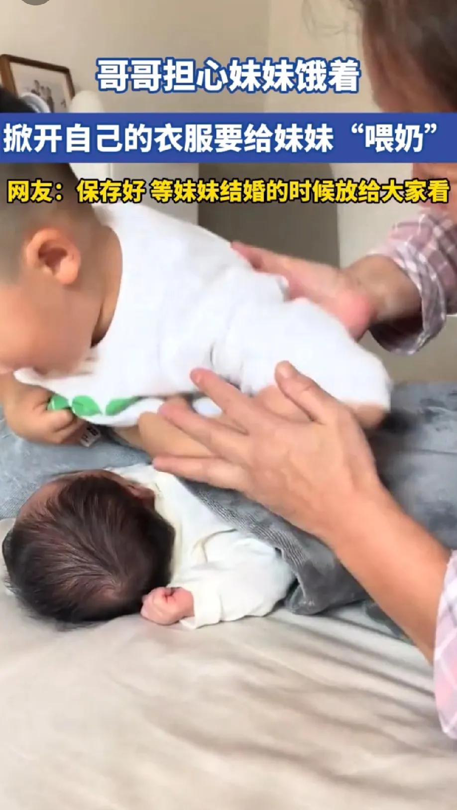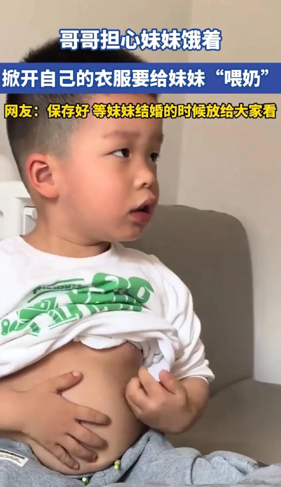 这哥哥太可爱了,是真心爱妹妹。哥哥担心妹妹饿着,掀开自己的衣服要给妹妹“喂奶”。