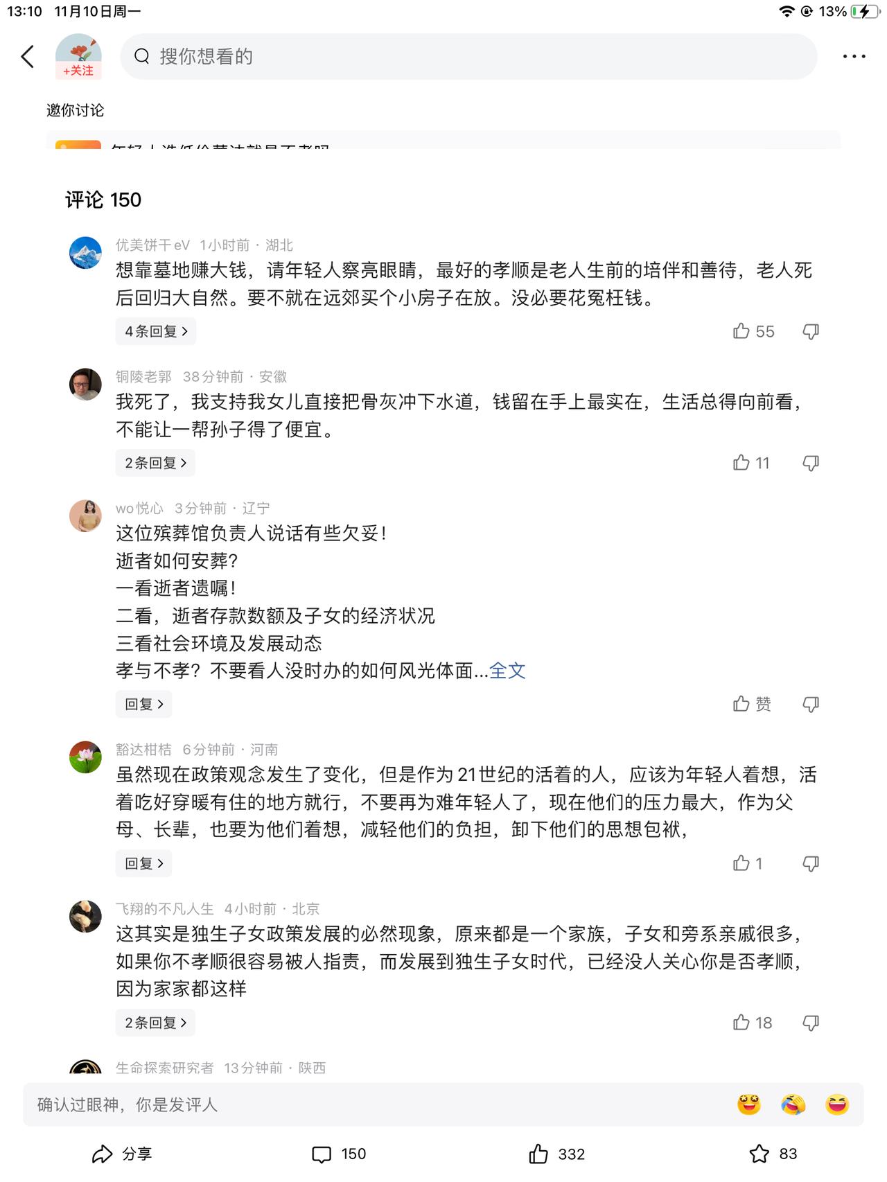 殡葬行业最近冲上热搜,导火索是一位墓园经理在推销时脱口而出“年轻人良心被狗吃了”,原因是有人给父母选了九九元花坛葬甚至免费的树葬,而不是动辄二三十万的墓地,这句话一出,评论区直接炸锅。 我爸,给我妈修了个碑,跟我爷那个尺寸小一点。我爸说,他不干,我们姐弟俩不会干的。就他们那一代人,不是傻子,就明显感觉到,我们这代人不会为这种事花钱。 活着的时候,回家吃顿饭,唠唠家常。陪我爹吹吹牛,给我妈夹点菜,这就是最好的孝顺。 我妈没的那个晚上,守灵,我还睡了一个多小时。哭累了,脑袋瓜里什么也没想。在炕上,没有害怕,盖着我个人的棉袄,睡了会。 我自责没有在第一时间回到家,对我妈进行抢救,后来我对象说,你知道人家想不想植物人一样的活?后来我想通了,妈没了,去了。孝顺下爹就行了。妈没了,那是大限到了,轻轻的,她走了,没有一丝留恋。活着的儿女,还有一堆网贷,其实,真的不轻松。