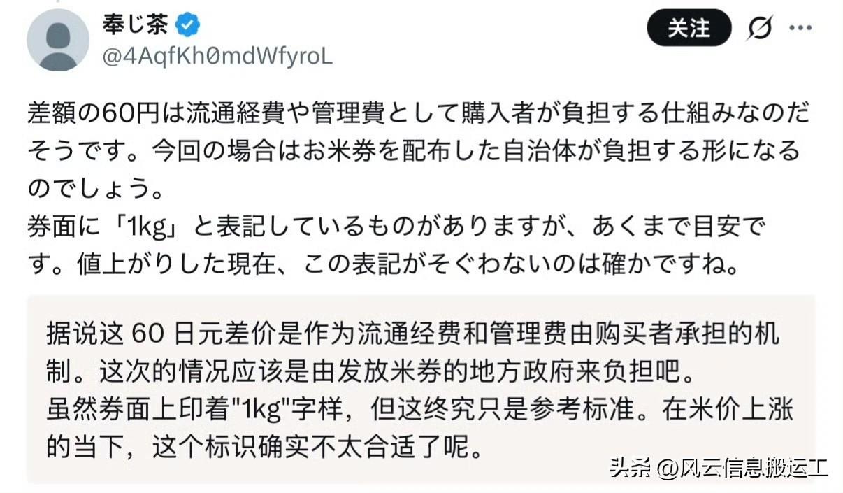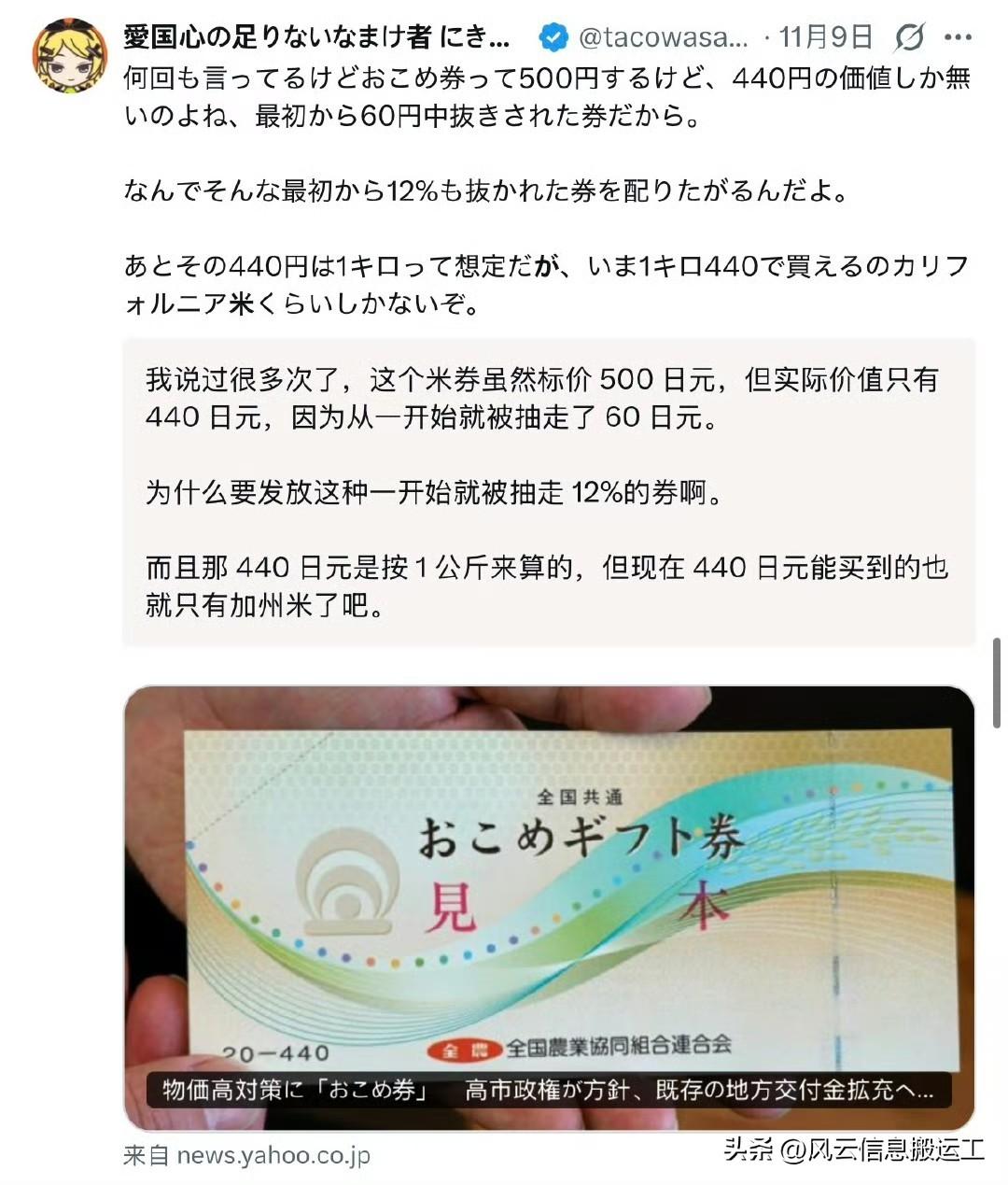 日本这个买米的粮票,面值440日元一张 发10张也只够买5公斤左右的米 另外,有日本网民表示,这个粮票实际是按500日元一张拨款的,但是购买面值只有440日元,每张都有60日元“漂没”了