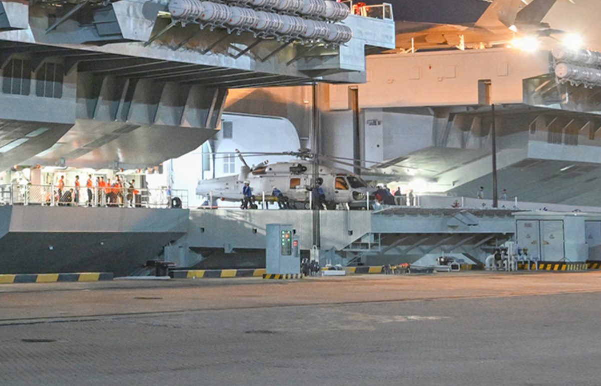 福建舰升降机转运折叠尾梁的直20F反潜直升机,后部挂架挂载轻型反潜鱼雷。