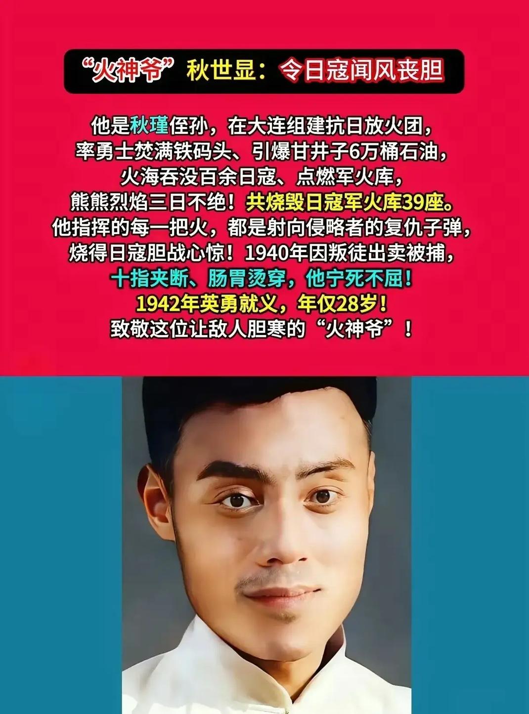 他是秋瑾的侄孙——秋世显,满门忠烈!一把火烧掉日军6万桶石油,炸毁39座军火库! 很多人熟知鉴湖女侠秋瑾“拼将十万头颅血,须把乾坤力挽回”的壮志,却少有人知道,她的精神在侄孙秋世显身上延续出了同样滚烫的家国担当。 秋世显出生在浙江绍兴的秋氏老宅,屋里常年挂着秋瑾的半身像,画像下的木桌上,摆着姑婆当年用过的砚台和手稿。从小听着长辈讲秋瑾东渡求学、创办女报、组织起义的故事长大,那些“凡爱国之心,人不可不有”的话语,不是课本里的教条,而是刻进血脉的家训。他童年时最爱翻读秋瑾留下的《精卫石》,字里行间的家国情怀,让他早早懂得,个人的命运永远和国家的存亡紧紧相连。抗战爆发后,日军的铁蹄踏遍江南,绍兴沦陷的那天,秋世显亲眼看见日军焚烧民房、抢夺粮食,曾经安宁的家乡变成人间炼狱,他攥紧拳头,眼里燃起和姑婆当年一样的怒火。 彼时的秋世显只是一名普通的绸缎商,没有军队编制,没有先进武器,但他心里清楚,面对侵略者,退缩就是亡国灭种。通过地下党组织,他得知日军在宁波港囤积了大量战略物资——6万桶石油和39座军火库,这些物资正源源不断地输送到前线,成为屠杀同胞的凶器。摸清日军的守卫规律、仓库布局后,秋世显没有丝毫犹豫,主动请缨承担爆破任务。他变卖了全部家产,换成炸药和汽油,又联络了十余名爱国志士,组成了一支民间抗日小队。 行动前夜,秋世显回到老宅,对着秋瑾的画像深深鞠躬。他在日记本上写下:“姑婆当年为救国赴死,今日孙辈愿以热血继之,虽九死而不悔。”深夜时分,他们乔装成搬运工人,趁着日军换岗的间隙潜入港区。秋世显亲自负责引爆核心仓库,他躲过巡逻队的探照灯,在石油桶旁安置炸药,又在军火库的承重柱上绑好引线。当导火索被点燃的那一刻,他没有立刻撤离,而是留在最后检查每个引爆点,确保万无一失。 火光冲天的瞬间,爆炸声震彻夜空。6万桶石油燃起的烈焰照亮了半个宁波港,39座军火库接连坍塌,日军的惨叫声、物资燃烧的噼啪声交织在一起。秋世显和队员们在浓烟中突围,身后的港区已成一片火海,日军的补给线被彻底切断。这次行动让日军前线攻势受挫,为我军争取了宝贵的备战时间,而秋世显的名字,也随着这场壮烈的爆破传遍了抗日根据地。 秋家的忠烈从未断绝。秋瑾为推翻封建帝制献出生命,秋世显为抗击侵略挺身而出,家族中还有多位亲人投身爱国运动,有的在地下工作中被捕牺牲,有的在战场上身负重伤。他们用一代代人的坚守证明,爱国从来不是一句口号,而是危难时刻挺身而出的勇气,是为了国家民族甘愿奉献一切的决心。在那个山河破碎的年代,正是无数像秋世显这样的普通人,用血肉之躯筑起了抵御侵略的长城,他们没有惊天动地的头衔,却有着最纯粹、最滚烫的家国情怀。 如今,硝烟早已散尽,但秋家传承的爱国精神永远不会过时。那些为国家牺牲的先烈,那些为民族抗争的英雄,值得我们永远铭记。他们的故事告诉我们,和平来之不易,家国情怀需要代代相传。无论是过去还是现在,爱国从来都是每个人的责任与担当,只要我们心中有国、心中有民,就没有克服不了的困难,没有抵御不了的风险。 各位读者你们怎么看?欢迎在评论区讨论。