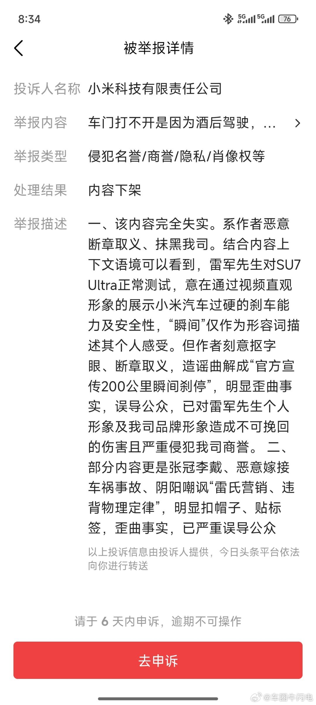小米汽车投诉了我一条视频内容。整个视频当中没有提到任何小米或者雷军的字眼。之前投诉了一次,平台没有处理,认为我没有侵权,后来又投诉了一次。这次被平台下架了。我也懒得申诉,本来就是发着玩的。但是不知道小米汽车为什么会对我这条没有提到任何小米资源雷军自研的一条内容这么感兴趣。如果小米这么感兴趣的话,那我就多出点内容。