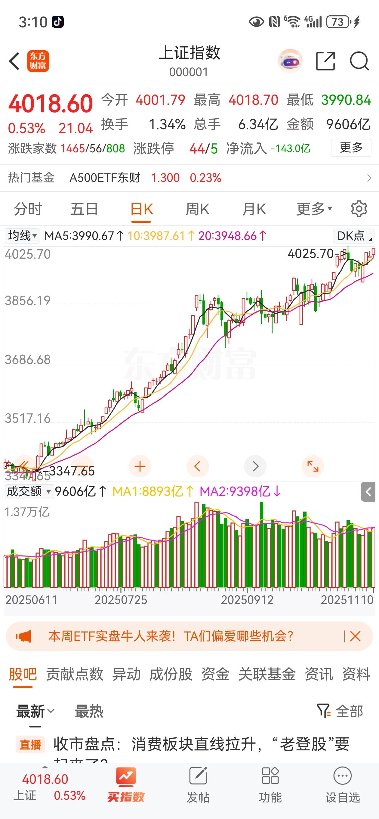 东财和中信两个难兄难弟,费劲九牛二虎之力,终于都涨了1.03% 真的是患难兄弟啊,涨幅都是一样的。今天能够顺利站稳4000以上,又是东财和中信两个夜壶的贡献。 今天收盘到4018.6,离前高4025已经不远了,明天要突破前高,还得要东财和中信联手发力。 从目前的走势,应该不是诱多,因为今天成交量表现不错,而且老登板块都涨的不错,存储芯片板块尾盘有抢筹。尾盘东北证券还封板了,证券板块已经好长时间没有涨停板了。 种种迹象表明,各路资金都在进,散户,游资和机构都在抢筹,明天突破前高的可能性比较大,我们拭目以待。 那个张半仙不是说近期不可能突破4025吗,我想让市场来教他做做人,让那些所谓的股神消停一下!