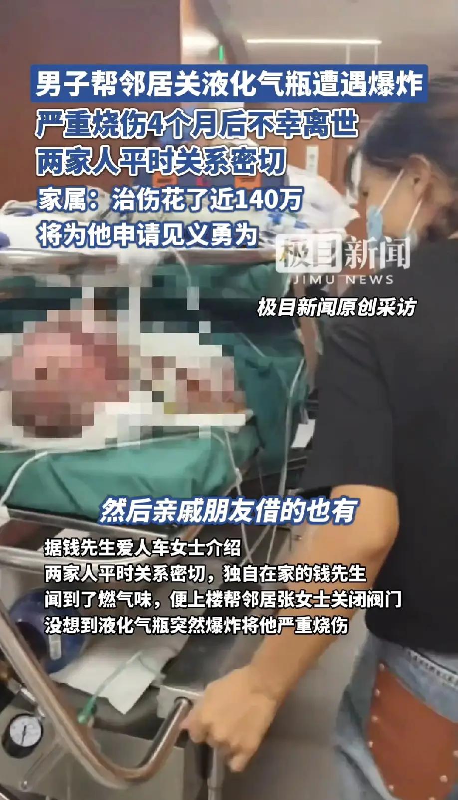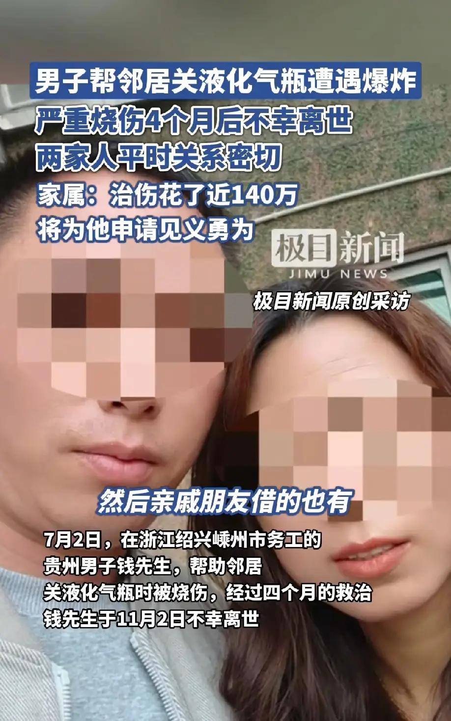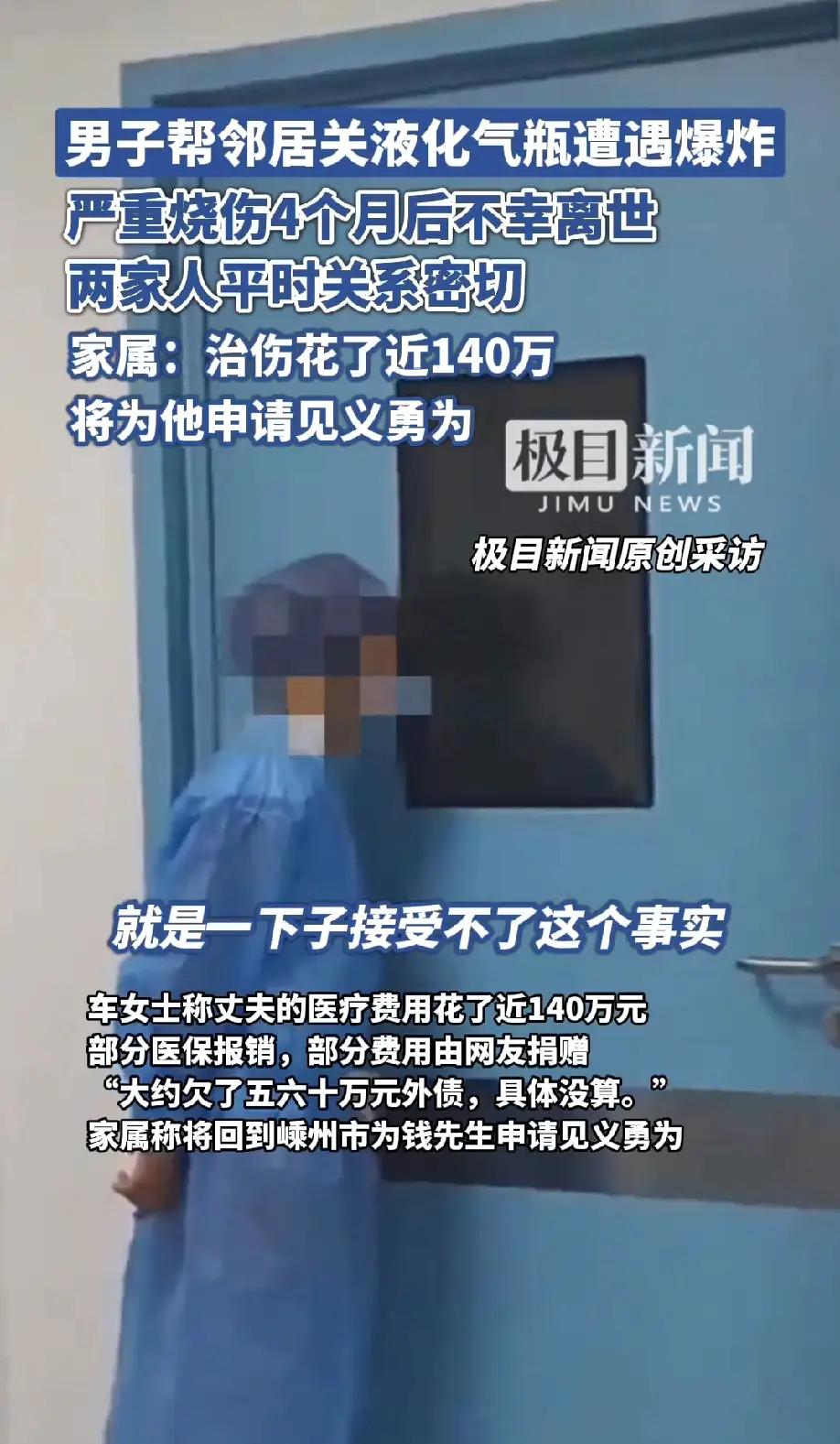 太让人痛心了!浙江绍兴嵊州市,一贵州icon男子出于好心帮邻居关液化气icon瓶,却没想到,液化气瓶发生爆炸,男子被大面积烧伤,在医院花费近140万治疗,4个月后不幸离世。家属将为他申请见义勇为。 这起令人心碎的事件,仿佛一面镜子,映照出我们社会中那些被忽视的善意与无奈。一个普通的男子,本着一颗善良的心,出于帮助邻居的善意,却未曾想到,这份善意竟换来了如此惨痛的代价。这样的故事,令人痛心,也让人反思:在这个快节奏、利益至上的社会里,我们是否还记得那份最纯粹的善良? 他只是一个普通的邻居,一个平凡的男子,没有任何特殊的背景,没有惊天动地的事迹,却用自己的行动温暖了身边的人。帮忙关液化气瓶,本是再普通不过的事情,却因为一场突如其来的爆炸,改变了他的生命轨迹。更令人心碎的是,他在医院花费了近140万的治疗费,付出了生命的代价。这样的悲剧,似乎在提醒我们:善意并不总能得到应有的回报,甚至可能成为无形的风险。 然而,更令人感动的是,他的家属准备为他申请“见义勇为”的荣誉。这不仅是对他生命的肯定,更是对那份善良的最高褒奖。在这个社会,善意的火苗或许微弱,但只要有人愿意伸出援手,就能点亮他人,也点亮自己。这个故事让我们重新思考:我们每个人是否都应该成为那个愿意伸出援手的人?在面对突发事件时,我们是否还能坚持那份“善良”? 或许,正是因为有像他这样的人存在,社会才会变得温暖而有希望。虽然他离开了,但他的善举不会被遗忘。这也提醒我们:在这个世界上,善良从未过时。它可能微不足道,但却能在关键时刻照亮他人的生命。我们不能保证每一次善意都能带来完美的结局,但我们可以坚信:只要心中有善,社会就会更加美好。 这起悲剧也让我们思考:我们是否应该为那些在危难中挺身而出的人提供更多的保护和支持?他们的善举值得被尊重和传递。或许,我们每个人都可以从身边的小事做起,传递善意,让这个社会变得更加温暖。 最后,希望这个故事能引发更多人的关注与反思。善良本身就是一种力量,它可以穿越阴影,带来希望。让我们一起,为那些在平凡中展现伟大的人点赞,也为这个世界多一份善意和温暖。你愿意成为那个在关键时刻伸出援手的人吗?欢迎留言,分享你的看法。燃气闪爆事故 煤气爆燃事故 液化气瓶瓶爆炸 浙江爆炸 燃气事故 液化气燃爆