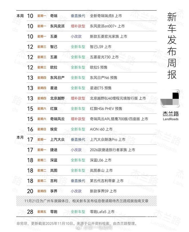 本周新车发布有几款车期待一下:智己LS9、星途ET5(HSD首款量产车型)、东风日产N6、岚图泰山、新款享界S9,大家还期待哪款车?新车上市