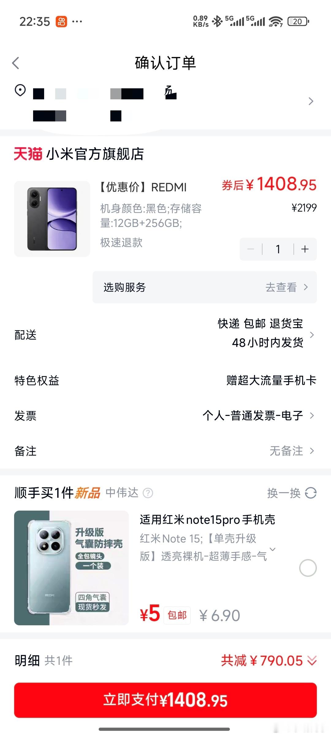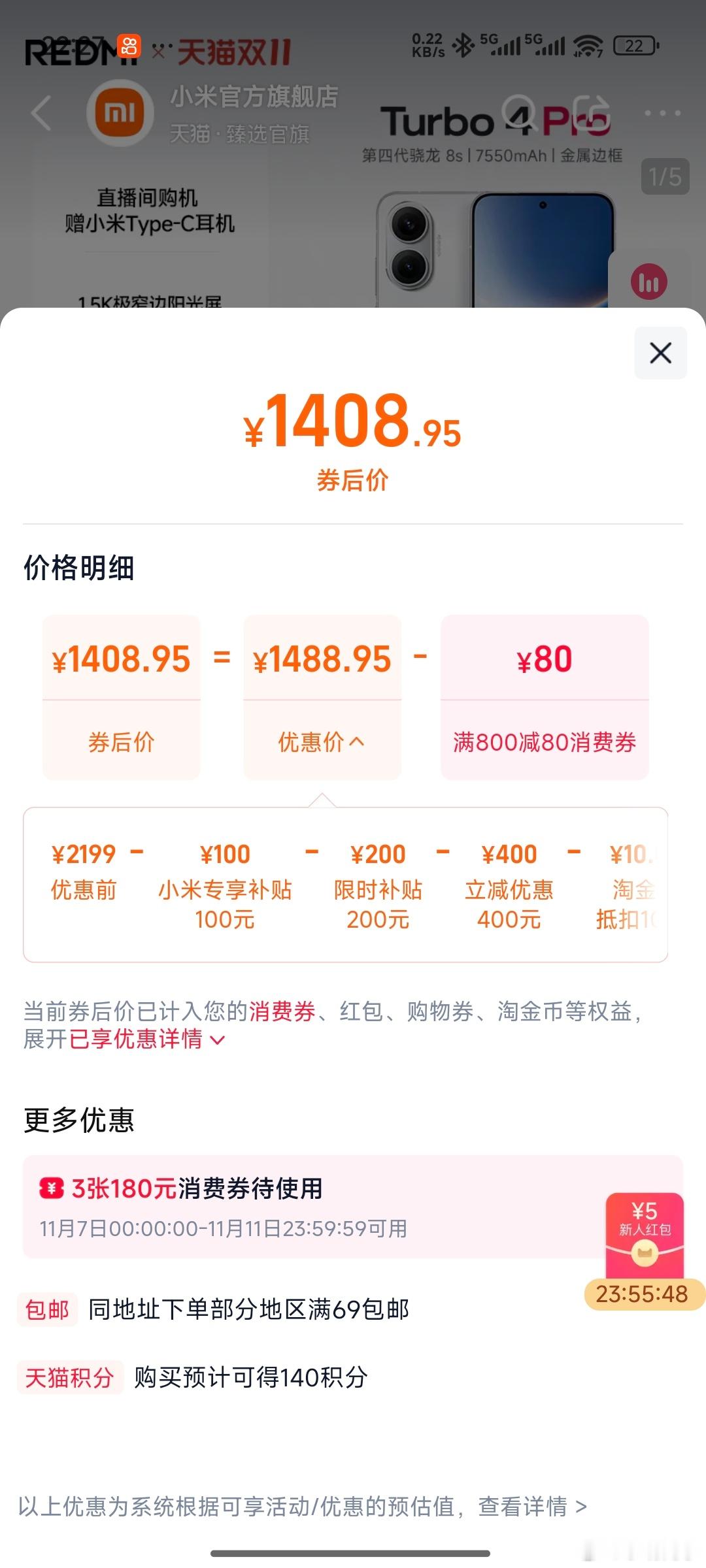 今年通过天猫的官方旗舰店给老爸选了一台Redmi的手机,结果一通领券满减后,原价2199元的手机足足减了近800元,到手价只要1400元,相当于省了近40%。