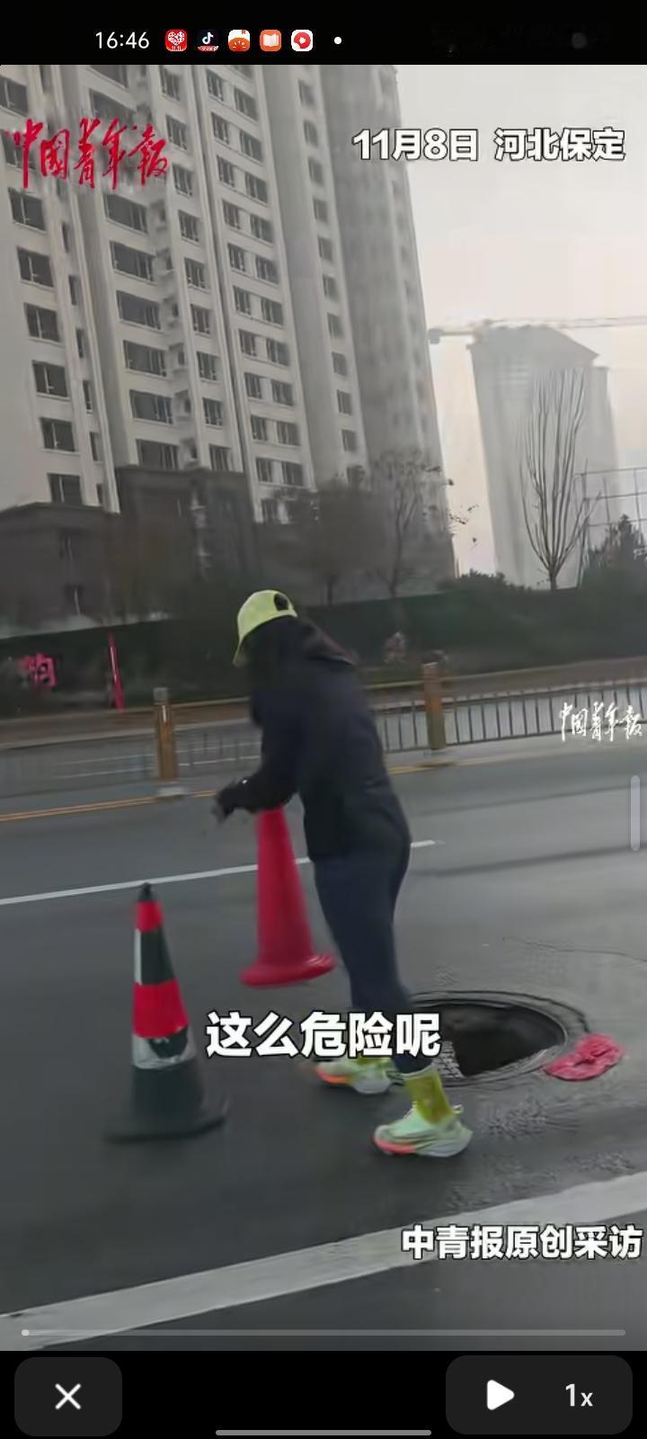 11月8日,保定市涞源县。女子发视频称,早晨和闺蜜路过县消防救援大队路段时,看到井盖缺了一大半,前方有汽车底盘碎片,应该是过往汽车发生的事故。于是,闺蜜跑到消防队借来锥桶,摆放在井盖周围提醒大家注意,之后就继续跑步了。后续就是井盖已经修好,锥桶还回去了。