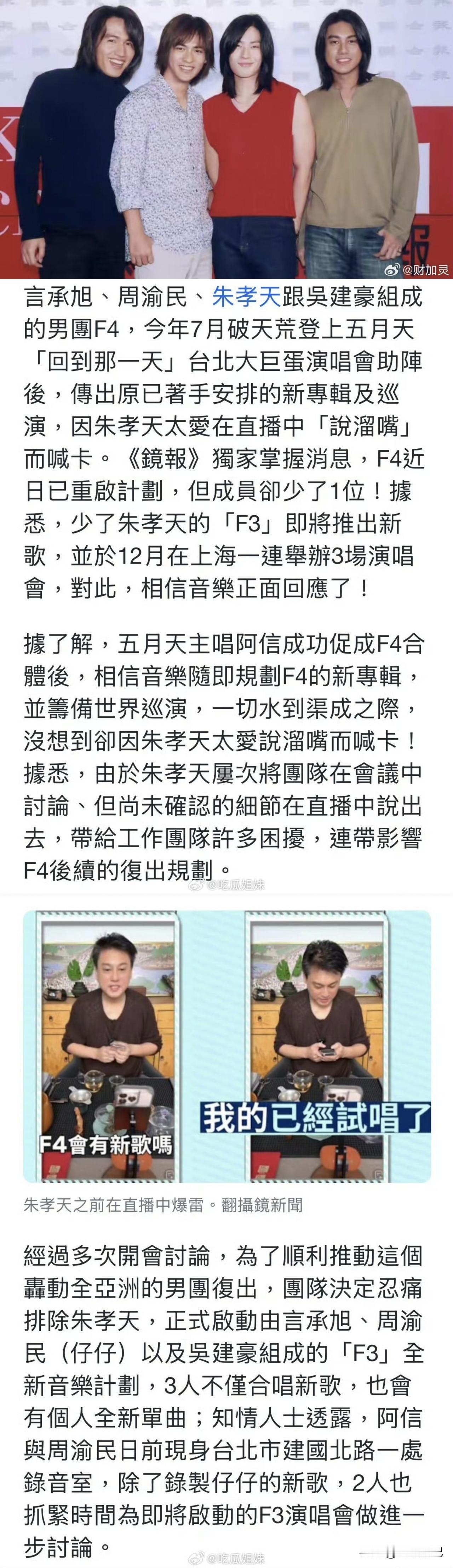 普天同庆!F4合体演唱会被曝没有朱孝天!主办方证实:只有F3! F4从出道就有第一时间的标签了,这个已经不是个人的行为了,是一个团体的共识啊,你既然还拿着F4的红利,就应该有维护团体形象的义务,无论你们私底下如何交往,那是你们自己的事,作为公众人物,朱孝天公开唱反调,确实不应该再带他玩。 确实有点不合群了,最起码要有点儿职业操守,面和心不和的多了,但是也没有朱做的这么明显,其实朱说的没错,本来就是工作关系,但是他也知道是工作,但是工作也要认真对待啊,我当牛马不高兴也要每天强颜欢笑的对待繁重的工作呢,看着朱现在真的不需要f4这个工作,应该是也过得很好。 没有他最好,上次五月天演唱会一手插兜唱歌显得格格不入,好像被逼来的一样。还有直播的时候是啥都往外说。