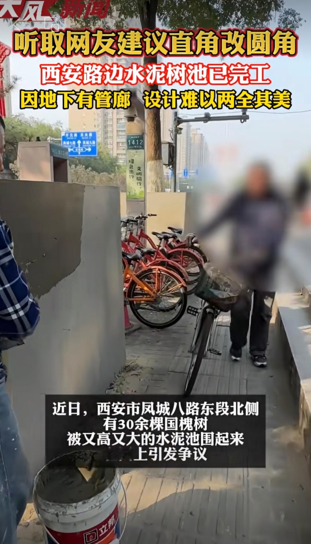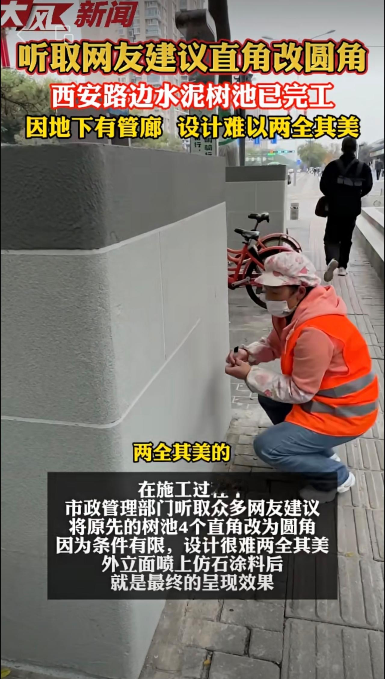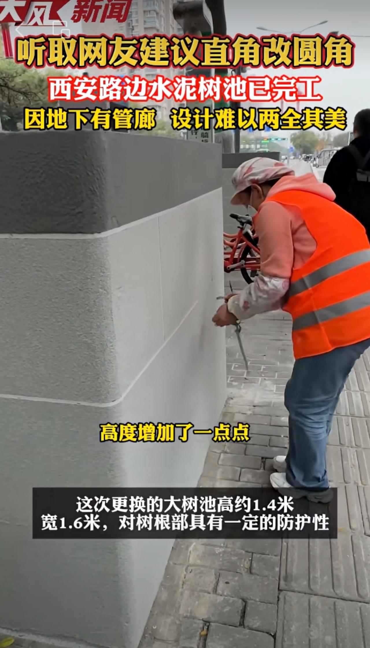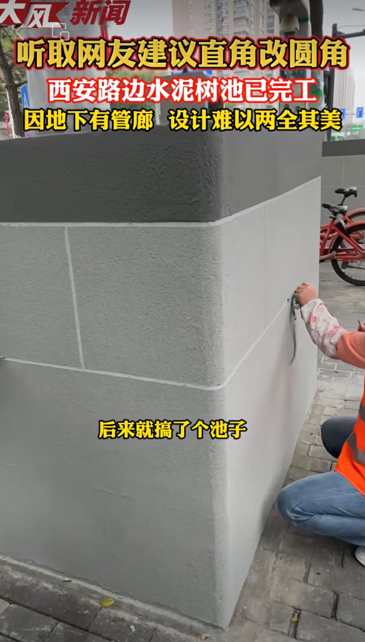 听取网友建议直角改圆角 路边水泥树池已完工 因地下有管廊 设计难以两全其美西安
