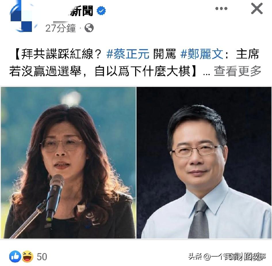 蔡正元没完没了了!再骂郑丽文自以为下什么大棋! 从前两天郑丽文参加岛内统派举行的“50年代白色恐怖政治受难者追思慰灵大会”后,国民党不少老蓝男和没信仰的年轻脑蓝就破防开轰郑丽文了。尽管郑丽文解释了她不是为祭奠吴石,是为了祭奠当时的普通受难者,是为了两岸和解。但民进党搞政治操作就算了,国民党不少人竟也无脑跟风骂。 尤其是蔡正元简直没完没了,今天又骂郑丽文了,脸书发文骂,直播视频骂,给绿媒提供子弹酸郑丽文。 我原来没觉得郑丽文有啥,现在看到不止绿营破防,蓝营也破防,我发觉郑丽文挺有种的,就像邱毅称赞的:郑是个孤胆女英雄。