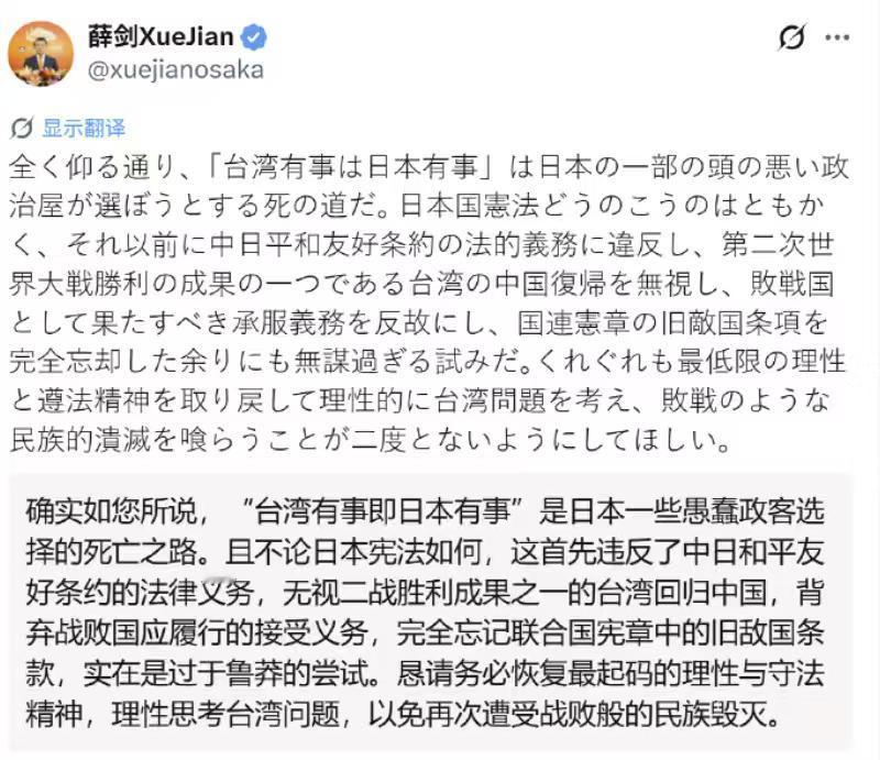 高市早苗明显是想跟我们对着干,她声称“台湾有事”,日本可能动用武力。对此,我们给予了坚决反对。我看到中国驻大阪总领事薛剑转发相关新闻,并写道“擅自伸过来的肮脏脑袋,只能毫不犹豫地砍掉。你做好觉悟了吗!”不过,据称该帖子很快就被日本人举报后删除。薛领事继续发帖硬刚,称“台湾有事就是日本有事”是死路一条。看到上述信息后,首先我要对薛领事给予崇高的致意,他真的不错,关键时刻,懂得维护我们的利益。其次,我想说的是,高市此女,过去就说过很多的暴论,给人的感觉就是无脑,说话不负责任。没曾想,上台后,她没任何长进,依然喜欢胡说八道。个人认为,她就是在打嘴炮,如果真到了那一步,我不认为日本干插手。万一真的插手了,不如趁机清算一下总账!