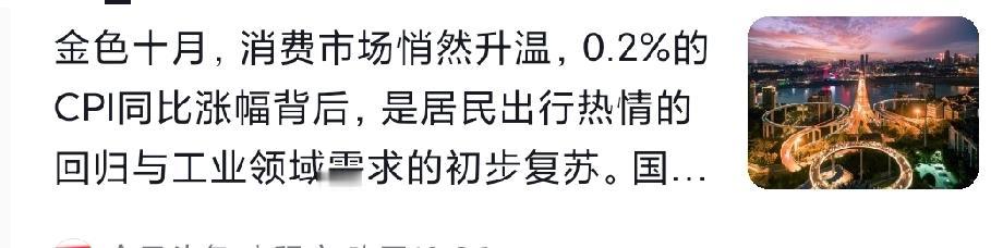 CPI同比涨幅超预期由负转正!这是不是意味着消费市场要迎来转折点?下周一A股的表现会更稳吗? 最新的经济数据刚一公布:10月份居民消费价格指数(CPI)同比上涨了0.2%,这可是时隔4个月之后首次实现同比增长!这个结果让不少投资者都感到意外,毕竟在此之前市场普遍预测的是同比下降。从这个数据来看,消费市场正在慢慢回暖,这对A股来说,无疑是多了一份上涨的底气。 其实早在10月底的时候,我就跟身边的朋友说过,消费市场已经触底了,不过那时候不少人都觉得我在开玩笑。结果呢?A股不仅一度突破了4000点,现在又迎来了这个相当于“王炸”级别的利好消息。虽然目前猪肉价格还在往下走,但整体的大趋势已经开始反转了。 那下周一A股市场的走势会怎么样呢?我觉得大概率会先小幅冲高,然后进入震荡调整的阶段。具体来看,4035点到4050点这个区间可能会遇到一些压力,而3958点附近则有比较强的支撑作用。像半导体、光伏这类一直保持高增长的板块,接下来可能会更受资金追捧,而证券板块或许会暂时“歇口气”,调整一下节奏。 不过这里要提醒大家,主力资金可能会在关键时刻适当压盘,控制一下上涨节奏。毕竟对于市场来说,“慢牛”才是更健康的发展趋势,涨得太快反而容易出问题。但从更长远的角度看,随着经济慢慢回暖,加上各种政策的支持,A股市场的“春天”应该真的要来了! 对于这次CPI同比转正的趋势,你觉得能持续下去吗?消费板块接下来会不会有一波大的上涨行情呢?