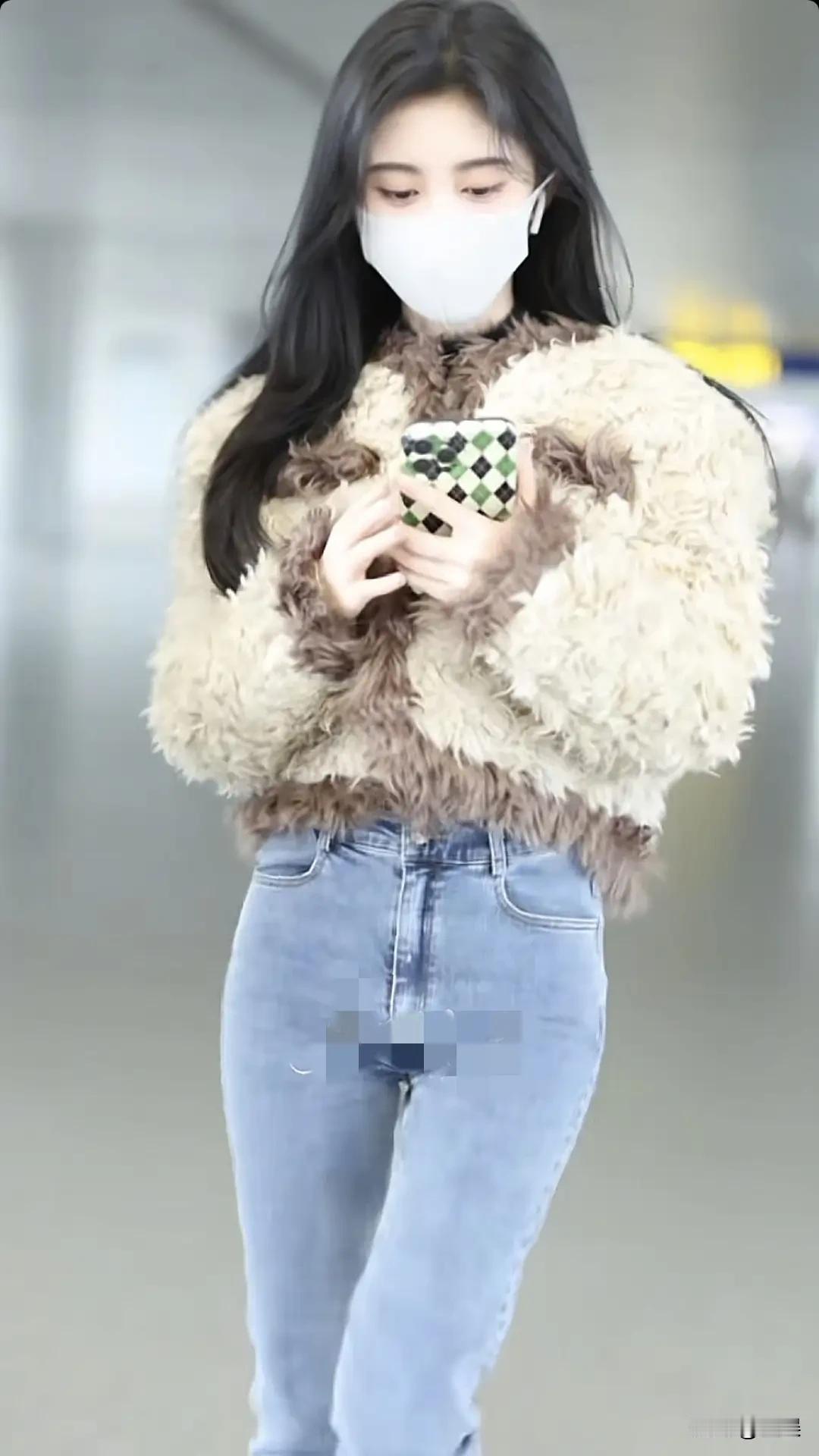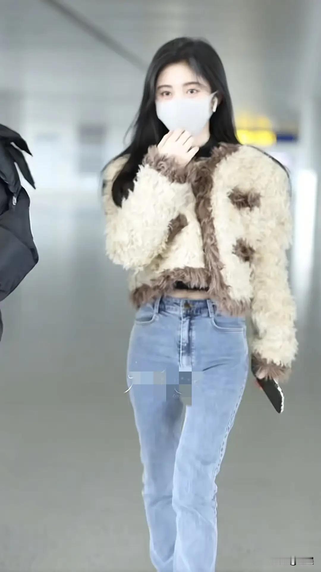 鞠婧祎毛绒短外套搭浅色牛仔裤,长发垂落