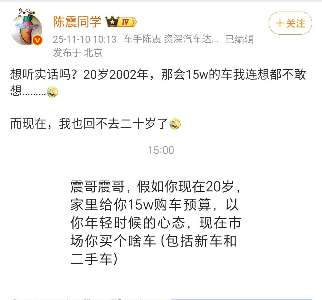 陈震:想听实话吗?20岁2002年,那会15w的车我连想都不敢想………[允悲]