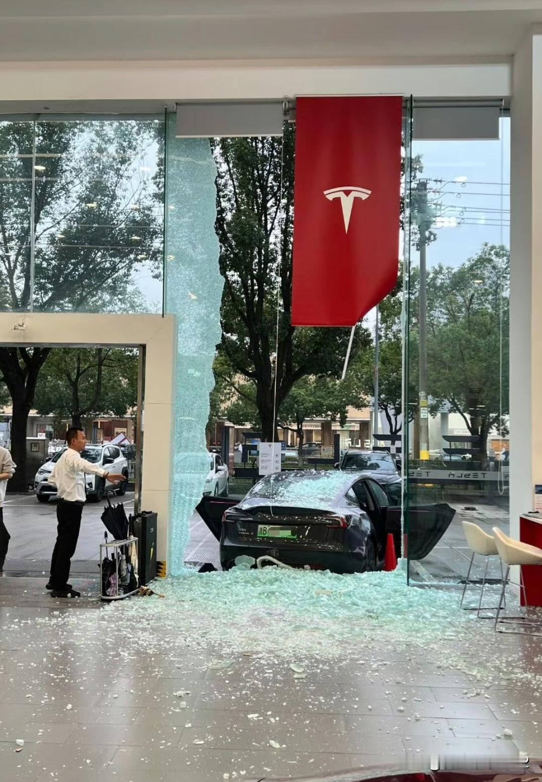 宁波,特斯拉撞了特斯拉玻璃墙❗️❗️ 大水冲了龙王庙了。 应该是客户试驾的时候,倒车技术太差造成。