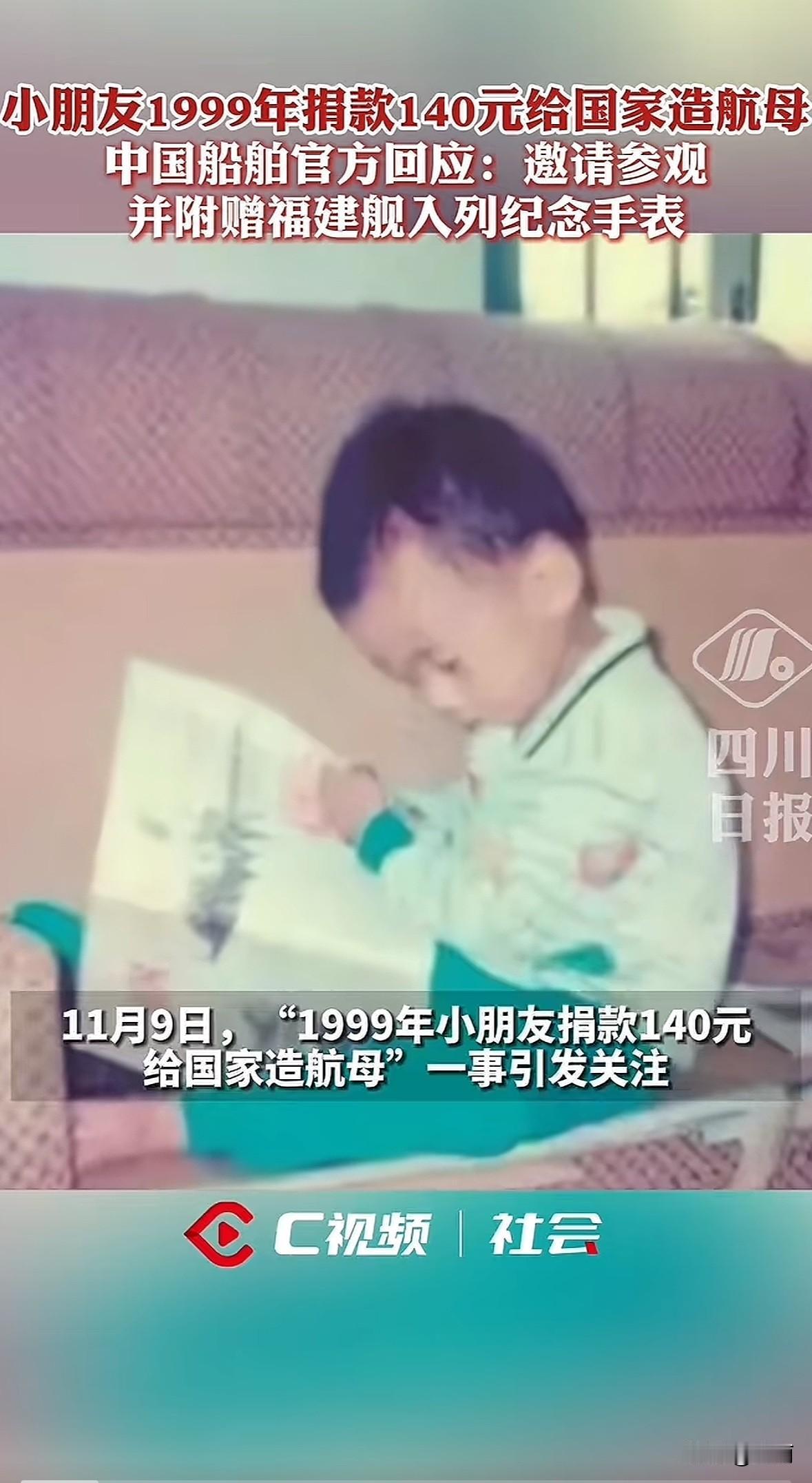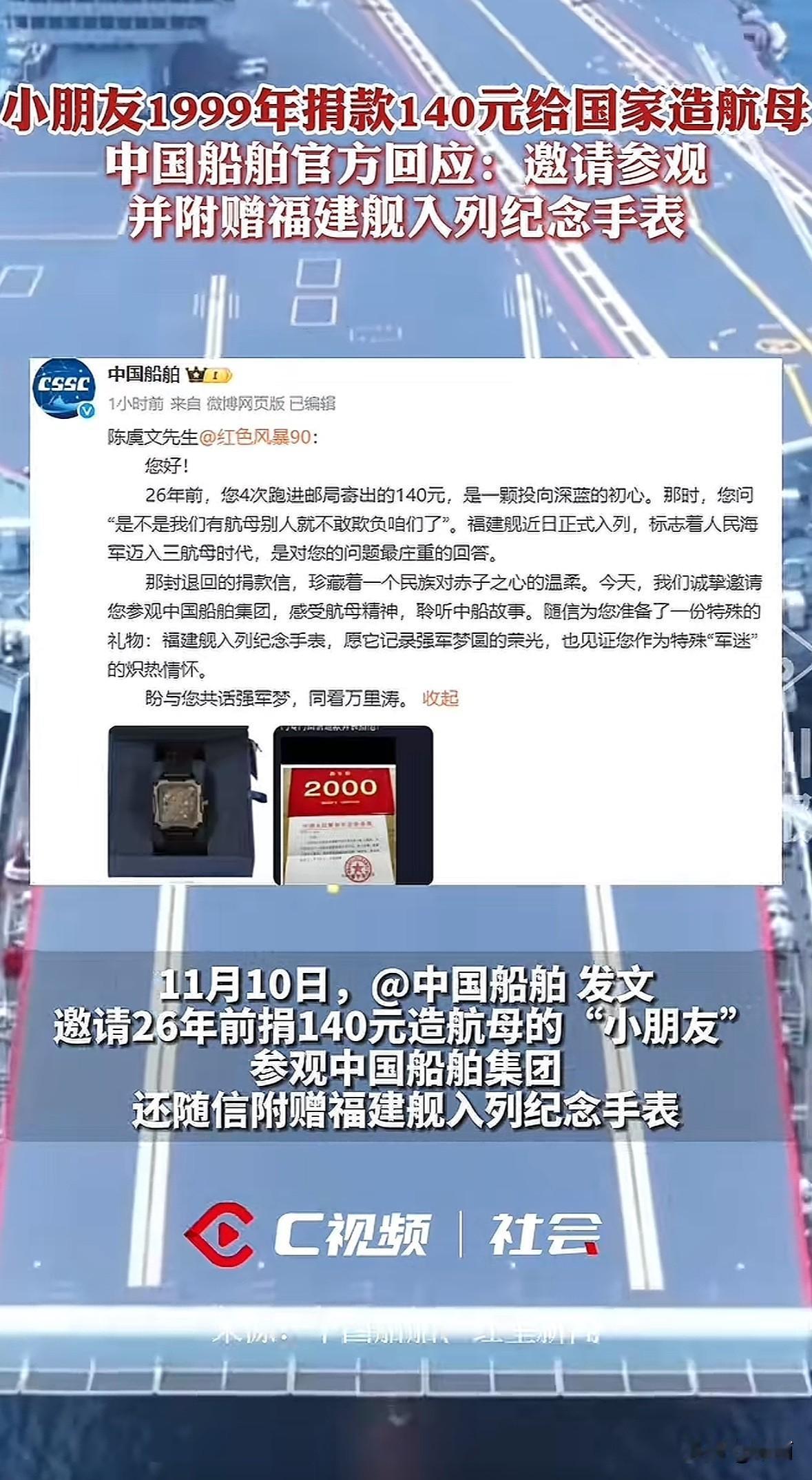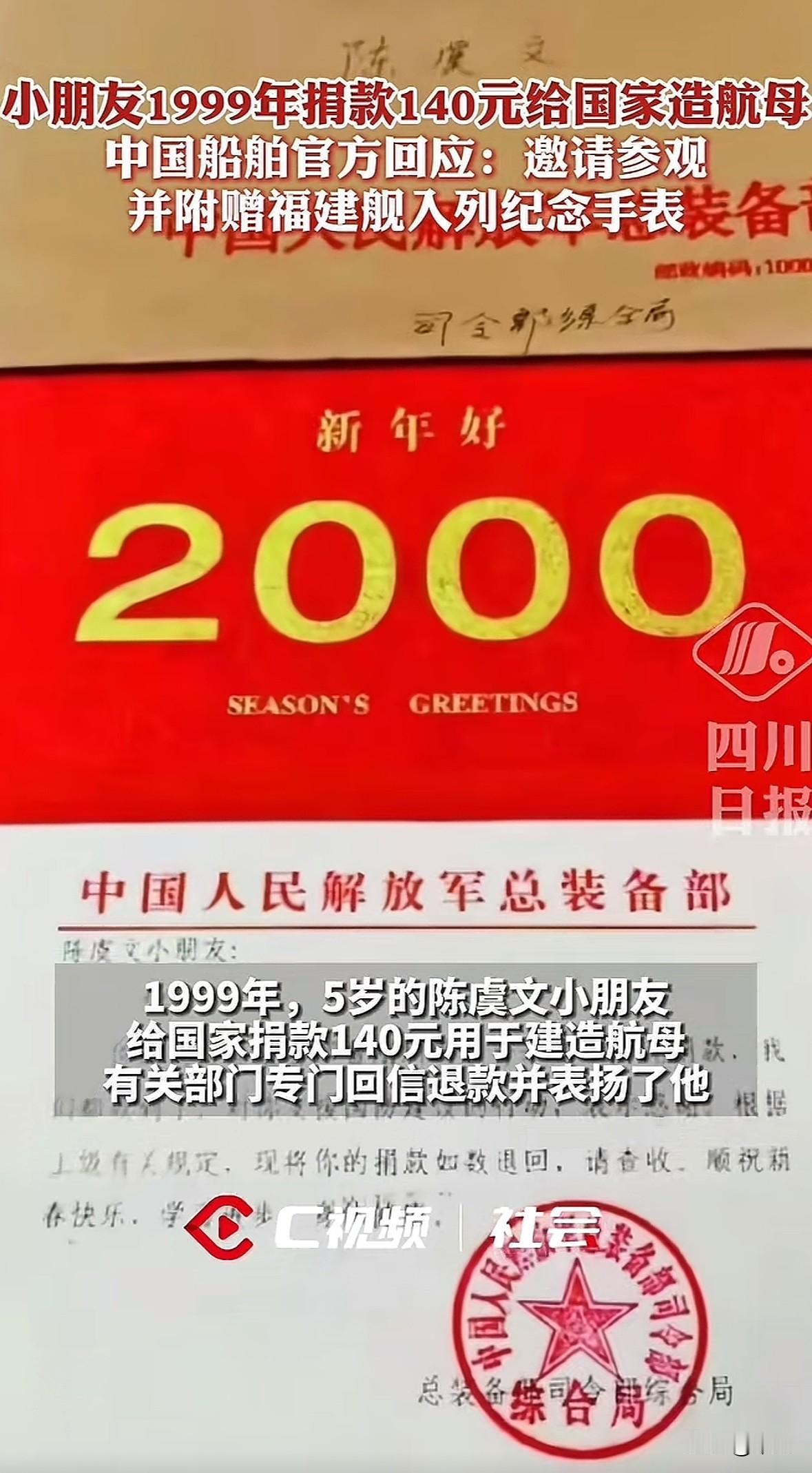 1999年,广西5岁的陈虞文看了北约轰炸中国驻南联盟大使馆的新闻,听爸爸说有人捐款造航母,就想着“有航母国家就不被欺负”,分4次寄了140元零花钱给总装备部。后来他收到回信和退款,还有一张新年贺卡。 26年后,中国已有三艘航母,@中国船舶 特意邀请他参观,还送了福建舰纪念手表。这140元是最纯粹的爱国心,当年的小小心愿如今彻底实现。国家越来越强,离不开每一份朴素的守护,这种双向奔赴的温暖,真的太让人感动了。