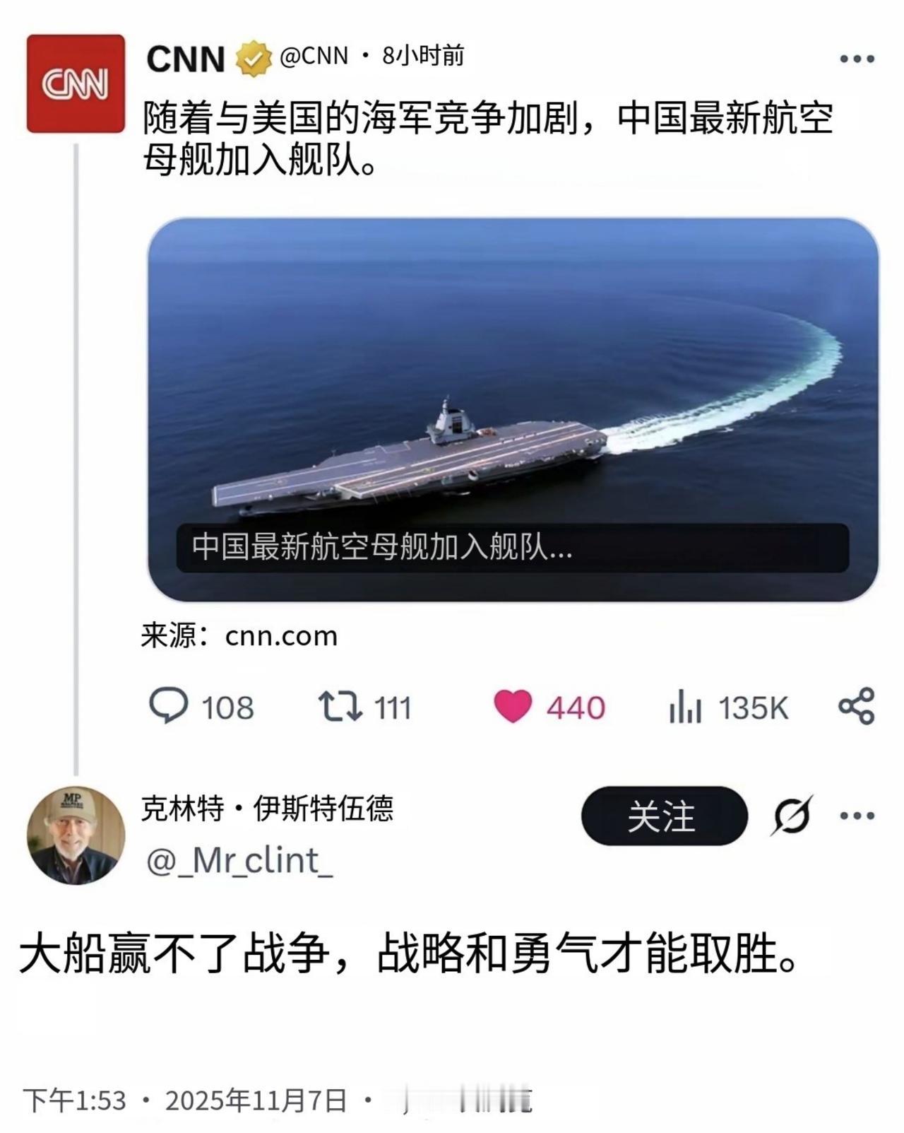 中国福建舰正式入列,美国人酸溜溜的评论,“大船赢不了战争,战略和勇气才能取胜”。 跟我们比策略和勇气,是不是拿错剧本了? 曾经,你们有钢铁洪流,而我们只有钢铁般的意志。 现在我们的钢铁都要有意志了,可你们别说钢铁般的意志了,就连你们的钢铁都快要进回收站了。 说白了,他们就是死鸭子嘴硬。
