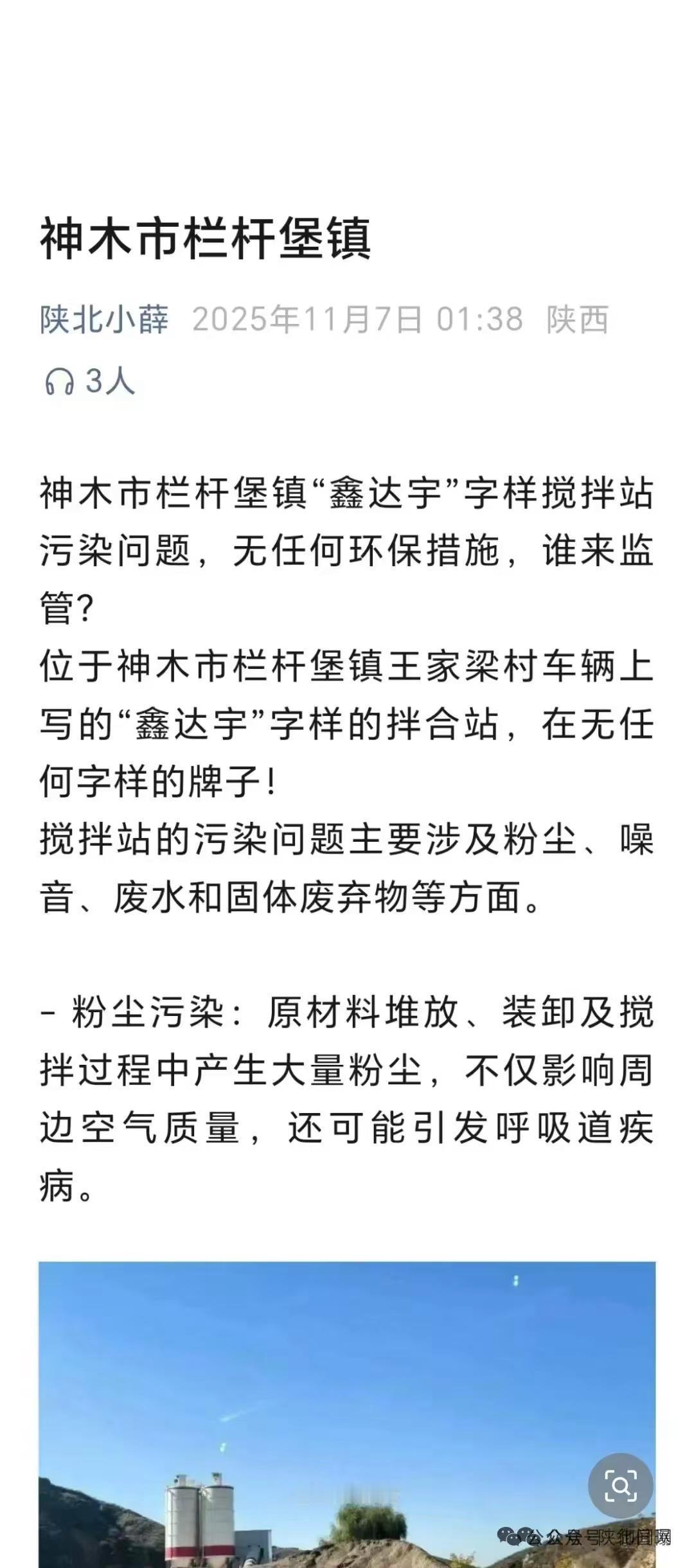 关于神木市栏杆堡镇王家梁村车辆上写的“鑫达宇”字样的拌合站,是否有相关手续?引发网友质疑! 近日有博主“陕北小薛”称:位于神木市栏杆堡镇王家梁村车辆上写的“鑫达宇”字样的拌合站,在无任何字样的牌子! 无任何环保措施,主要污染问题涉及粉尘、噪音、废水和固体废弃物等方面。从图片中可以看出,这个拌合站生产区域没有摆放任何警示牌,神木市国土资源规划局以及住建局是否办理相关审批手续?原材料随处摆放,没有任何环保措施,生产区域明显可以看出,生产期间产生的大量粉尘,对周边的空气带来严重的污染,这样的生产模式,是否对周边居住的居民带来严重的呼吸道疾病。搅拌站是环保责任主体,神木市环保局是否核查该搅拌站的环评与审批手续?是否履行日常监管,确保设施正常运行?是否每日对该搅拌站内外废气、废水、噪声进行环境检测,并上报数据?
