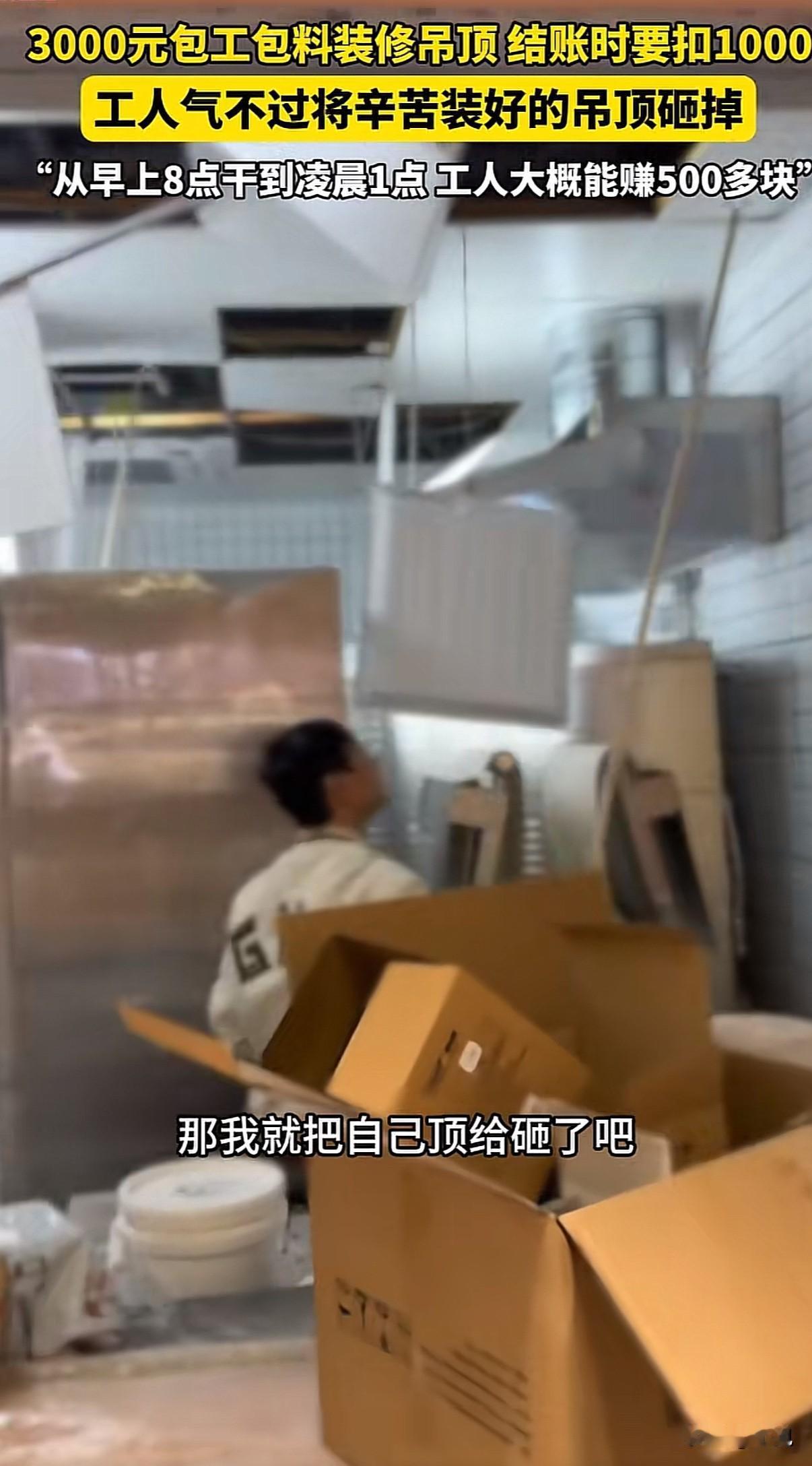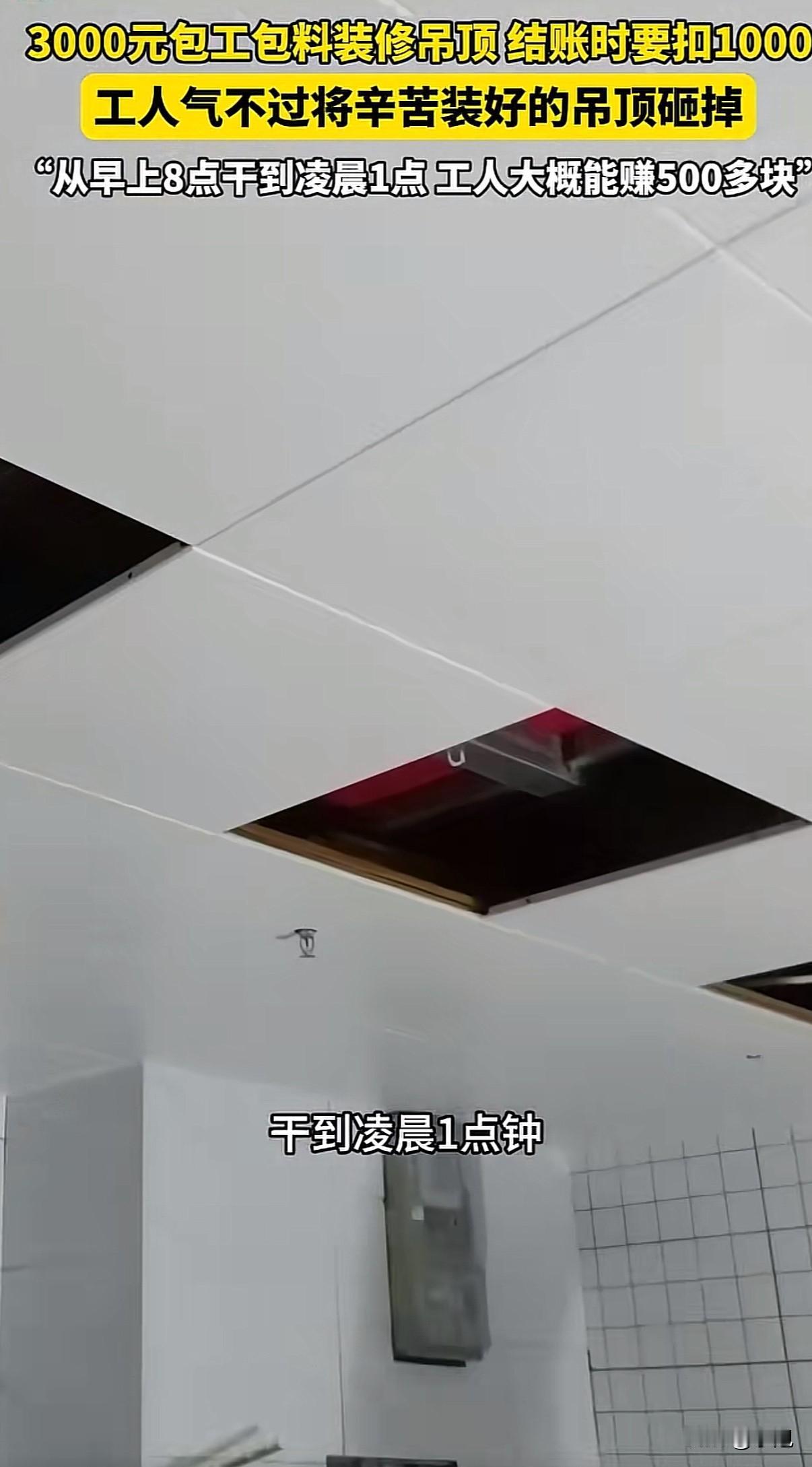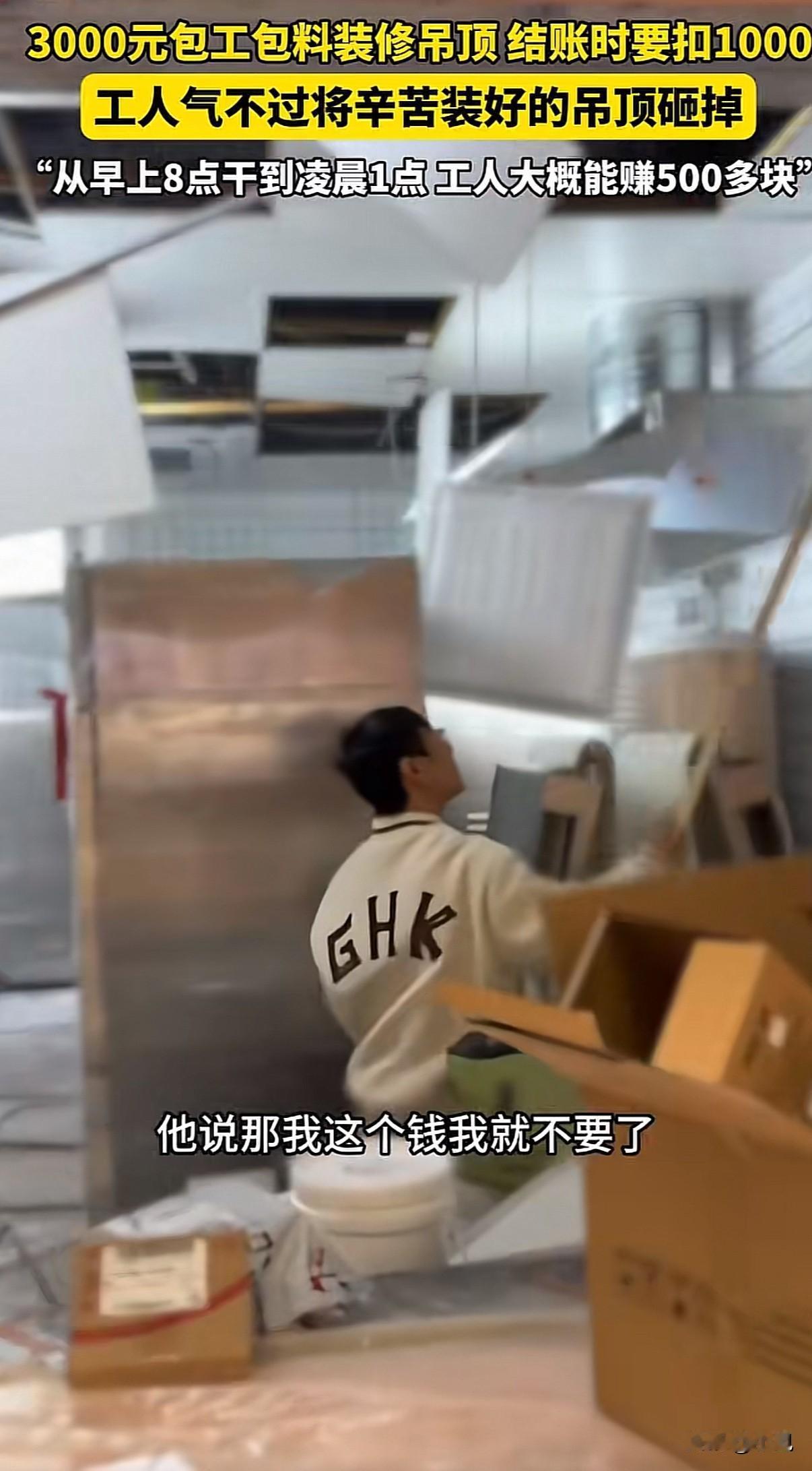 一个装修工人,从早上8点一直干到凌晨1点,整整17个小时,就为了把吊顶做完。谈好的3000块钱,完工了却说只能给2000。 工人一气之下,把自己装好的吊顶给拆了。 这事儿发生在武汉。工人接活时,和雇主说好了包工包料3000元。这个价格不仅包括人工,还包含了所有材料费用。 当天一大早,工人就开始忙活。测量、切割、安装,每个环节都认真完成。 从清晨到深夜,连续工作了17个小时。直到凌晨1点,吊顶终于安装完毕。 工人累得直不起腰,正准备收工结账。 没想到雇主看了看完工的吊顶,却说:“你这活干得不行,得扣1000块。” 工人愣在原地,握着工具的手微微发抖。 “我从早干到晚,连口水都顾不上喝,怎么就扣这么多?” 雇主态度坚决:“我说扣就扣,只能给2000。” 工人越想越气,转身拿起工具,对着刚装好的吊顶就砸了下去。 “既然你觉得不值3000,那我就拆了它!” 刚刚完工的吊顶,转眼间变成了一地碎片。 包工头接到消息赶过来,看到这个场面也很无奈。 “不管怎么样,都不该扣工人这么多钱。”包工头选择了报警处理。 据了解,这3000元里,工人真正能赚到手的工钱,大概只有500元左右。剩下的都是材料成本。如果被扣1000元,就意味着工人不仅白干了这么久,可能还要倒贴材料费。 这种事情在装修行业并不少见。 很多装修活都是口头约定,没有正式合同。完工时雇主任意压价的情况时有发生。 工人往往处于弱势地位。他们付出了劳动,却很难保障自己的权益。 有的工人会保留微信聊天记录作为证据。就像最近海南乐东法院审理的一个案子,装修公司老板想扣工人一半工资,幸亏工人保留了聊天记录,最后法院判决公司必须全额支付。 在这件事里,工人拆吊顶的做法确实冲动。但也能理解,那是辛苦劳动不被尊重的愤怒。 如果双方能有书面约定,或者结算时能好好沟通,也许就不会闹到这个地步。 现在警方已经介入处理。希望事情能有个公平的解决。 每个靠双手吃饭的劳动者,都值得被尊重。他们的劳动,不该这样被轻易否定。