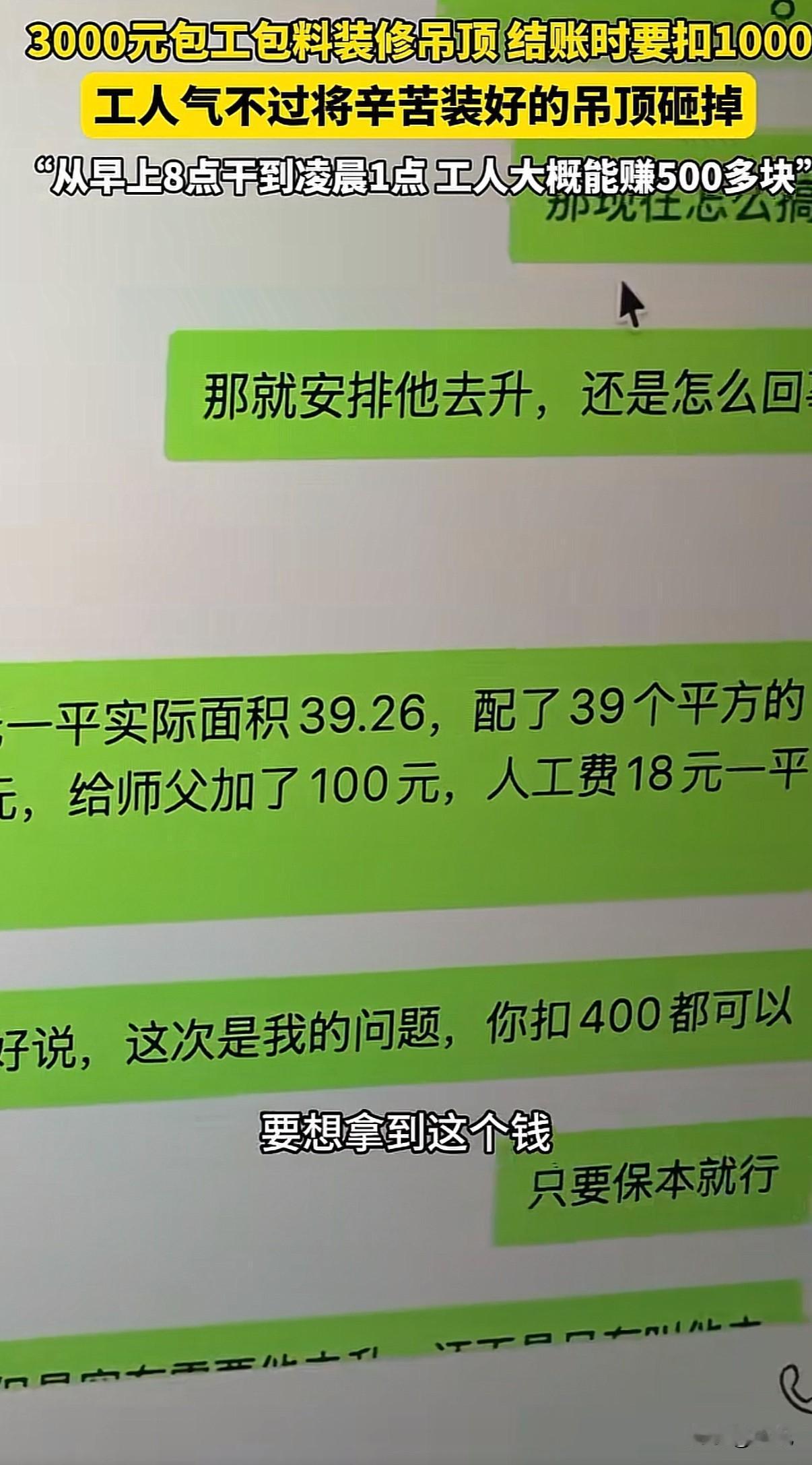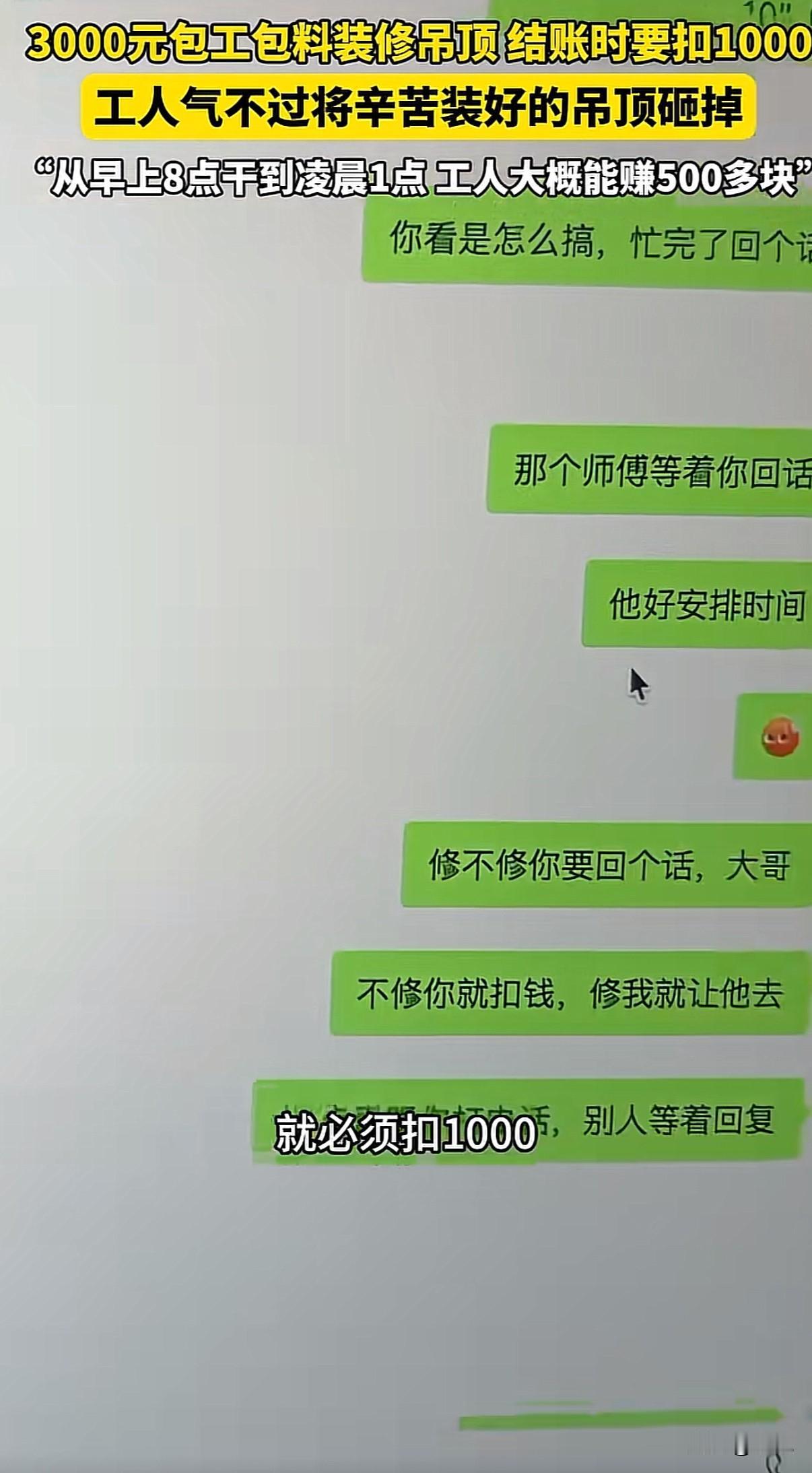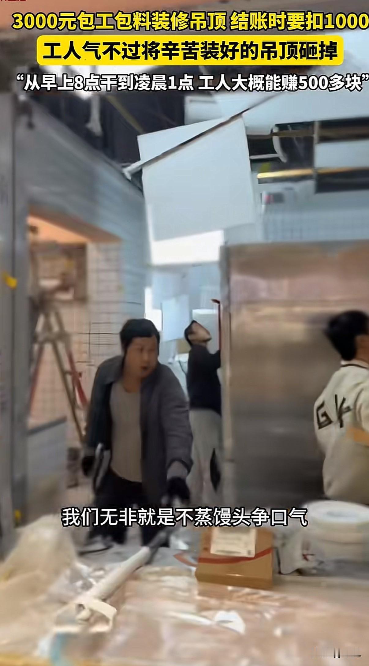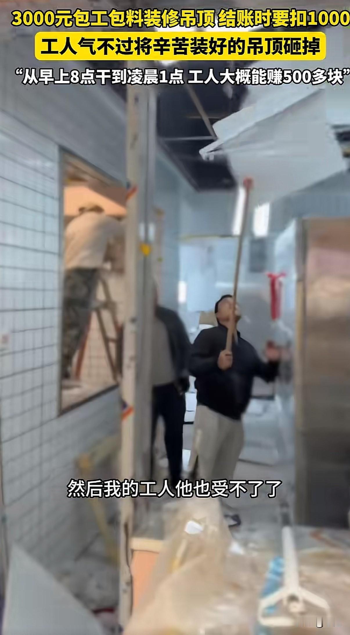 一个装修工人,从早上8点一直干到凌晨1点,整整17个小时,就为了把吊顶做完。谈好的3000块钱,完工了却说只能给2000。 工人一气之下,把自己装好的吊顶给拆了。 这事儿发生在武汉。工人接活时,和雇主说好了包工包料3000元。这个价格不仅包括人工,还包含了所有材料费用。 当天一大早,工人就开始忙活。测量、切割、安装,每个环节都认真完成。 从清晨到深夜,连续工作了17个小时。直到凌晨1点,吊顶终于安装完毕。 工人累得直不起腰,正准备收工结账。 没想到雇主看了看完工的吊顶,却说:“你这活干得不行,得扣1000块。” 工人愣在原地,握着工具的手微微发抖。 “我从早干到晚,连口水都顾不上喝,怎么就扣这么多?” 雇主态度坚决:“我说扣就扣,只能给2000。” 工人越想越气,转身拿起工具,对着刚装好的吊顶就砸了下去。 “既然你觉得不值3000,那我就拆了它!” 刚刚完工的吊顶,转眼间变成了一地碎片。 包工头接到消息赶过来,看到这个场面也很无奈。 “不管怎么样,都不该扣工人这么多钱。”包工头选择了报警处理。 据了解,这3000元里,工人真正能赚到手的工钱,大概只有500元左右。剩下的都是材料成本。如果被扣1000元,就意味着工人不仅白干了这么久,可能还要倒贴材料费。 这种事情在装修行业并不少见。 很多装修活都是口头约定,没有正式合同。完工时雇主任意压价的情况时有发生。 工人往往处于弱势地位。他们付出了劳动,却很难保障自己的权益。 有的工人会保留微信聊天记录作为证据。就像最近海南乐东法院审理的一个案子,装修公司老板想扣工人一半工资,幸亏工人保留了聊天记录,最后法院判决公司必须全额支付。 在这件事里,工人拆吊顶的做法确实冲动。但也能理解,那是辛苦劳动不被尊重的愤怒。 如果双方能有书面约定,或者结算时能好好沟通,也许就不会闹到这个地步。 现在警方已经介入处理。希望事情能有个公平的解决。 每个靠双手吃饭的劳动者,都值得被尊重。他们的劳动,不该这样被轻易否定。