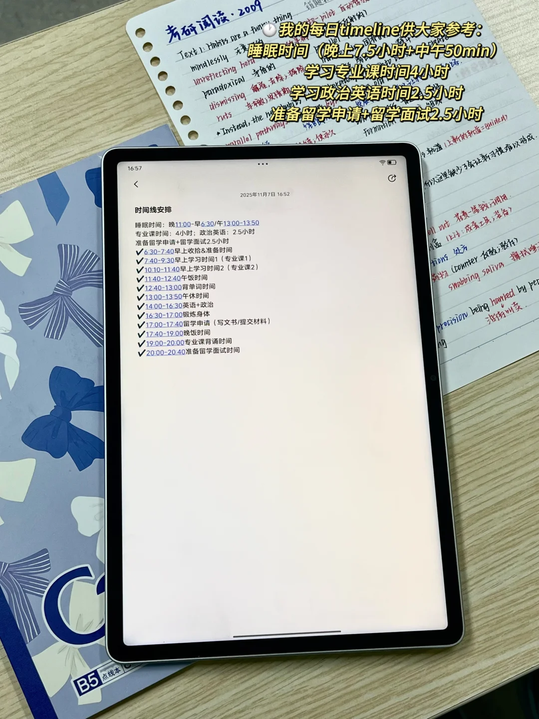 睡眠时间(晚上7.5小时+中午50min);学习专业课时间4小时;学习政治英语时间2.5小时;准备留学申请+留学面试2.5小时☑️