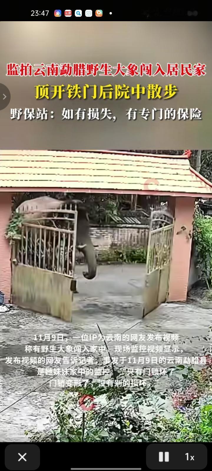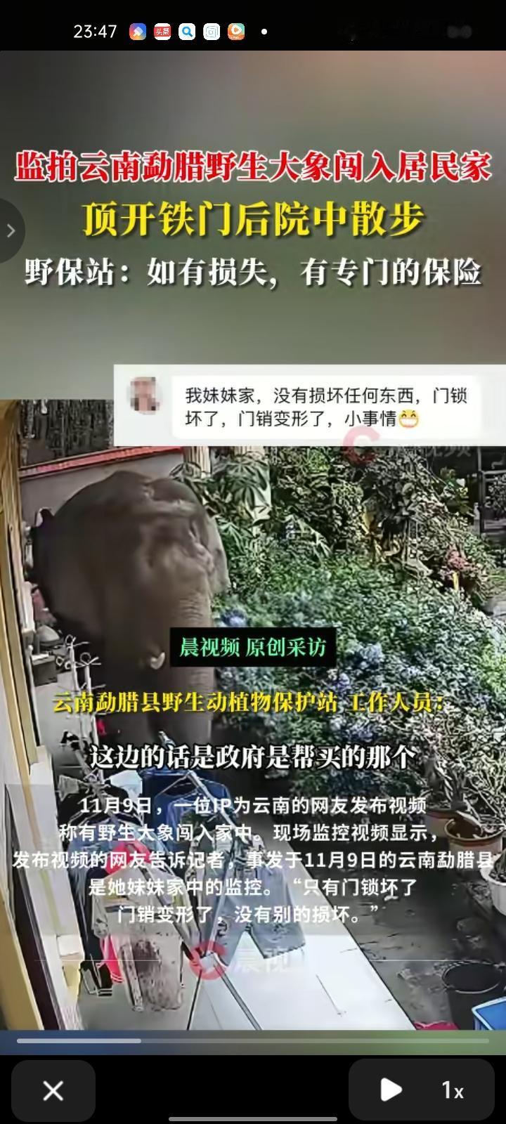 11月9日,西双版纳州勐腊县。网友发视频称,院子里有野生大象顶开铁门闯入后,在后院中干部。他表示,这是妹妹家的监控,铁门只有门锁坏了,门销变形了。 勐腊县野生动植物保护站工作人员表示,当地政府有购买野生动物肇事公众责任保险,大象属于野生动物,进家破坏一些东西的话可以按照工众险进行理赔。 野生大象闯入民宅虽带来意外惊扰,但勐腊县提前部署的野生动物肇事公众责任保险,为居民的财产损失提供了及时的兜底保障,尽显地方在人与自然和谐共生治理中的前瞻性。