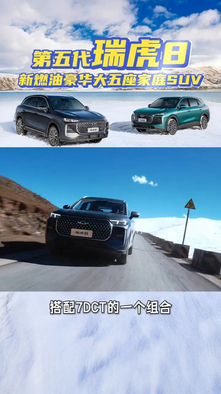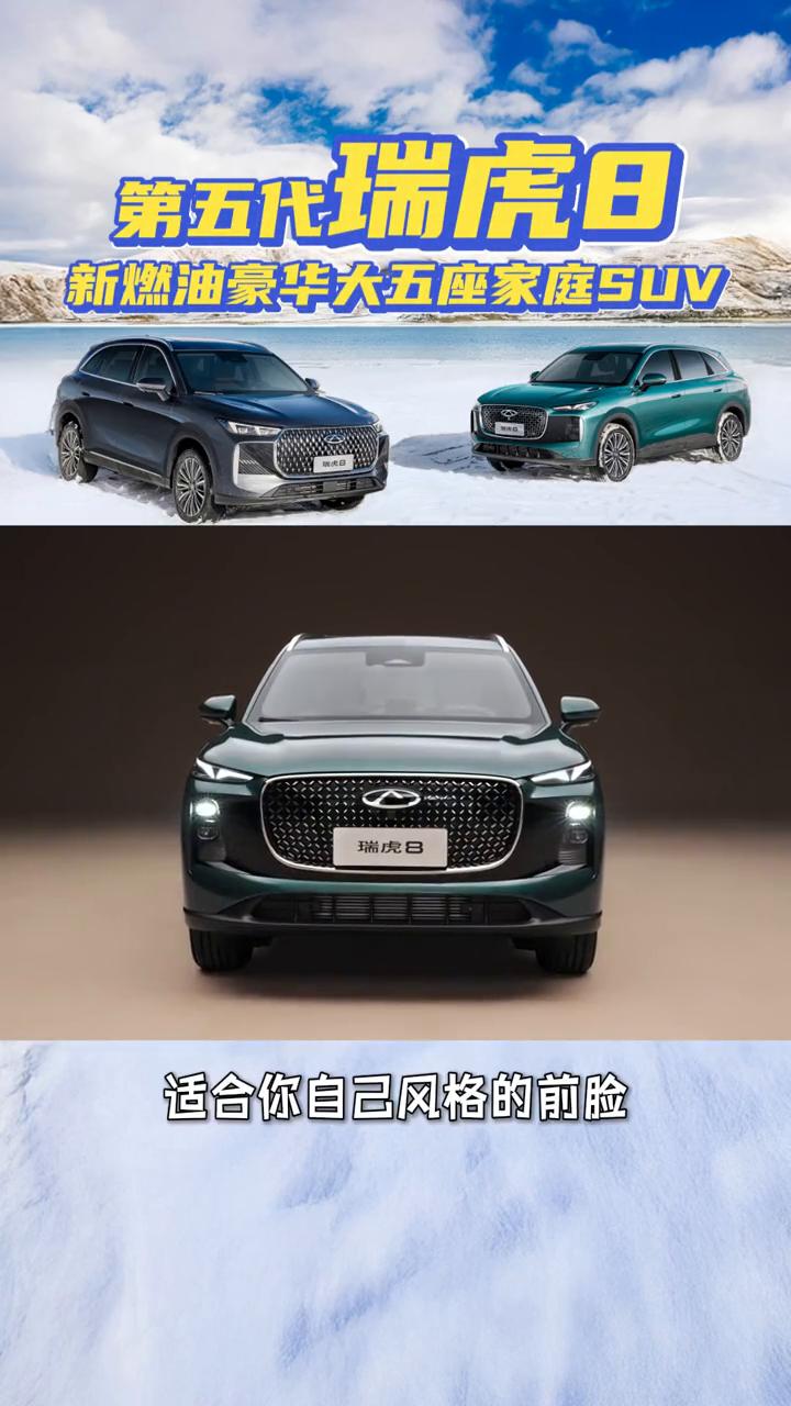 第五代瑞虎8,新燃油豪华大五座家庭SUV。 朋友们,火急火燎从国外飞回来了,原定是要在那边多玩几天的,但是我得赶回来参加第五代奇瑞瑞虎8的上市。都知道我喜欢油车,多过于新能源车,瑞虎8已经进化到第五代,现在怎么看怎么好看,话不多说,先看车。 这次第五代的瑞虎8有两种前脸,一个是虎式的,一个是豹式的,都特别帅,特别好看。虎踞前脸看上去相对来说是稳重一些的,豹跃前脸是比较运动的,找一款适合你自己风格的前脸。 这两款车的轴距都是2825mm,豹跃的车长是4725mm,虎踞是4740mm,车宽也是一样的,高度差别不大。门把手是半隐藏式的,机械式的门把手是我喜欢的设计。后备箱容积是546L,放倒后能来到1453L,还是非常能装的。 两款车的内饰做工用料都非常不错,前排座椅都带通风、加热跟按摩,附加带腿托。但是这个中控屏,虎踞是15.6寸的横屏的设计,豹跃是13.2寸的竖屏设计。这两款车都保留了一些物理按键,这个要给好评。 动力方面就是一台1.6T的发动机,搭配7DCT的组合,峰值功率147KW,峰值扭矩310N.m。相信你们已经迫不及待价格了,去看看。 第五代瑞虎8总共有四个版本,它的价格:旗舰型12.99万元,尊贵型11.99万元,豪华型10.99万元,舒适型9.99万元。限时抢先价,全系直降7000元,9.29万到12.29万元。这个价格满不满意? 还有一个最大的权益可以同享,就是超级的置换政策,另享8000-12000不等。价格出样,你们猜对了吗?这个价格我认为非常的接地气。两款车造型能满足不同年龄段的需求,最关键是油车。还犹豫什么?整。