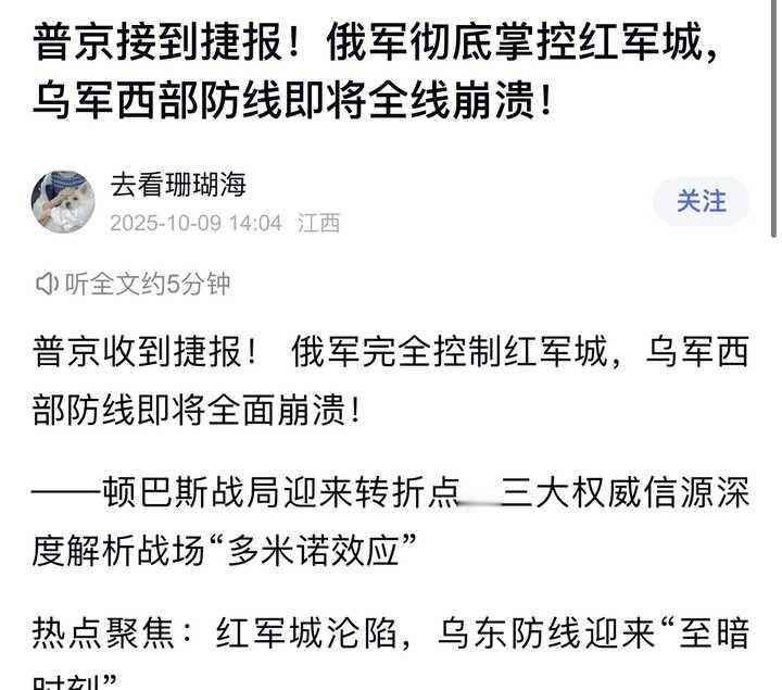如何看待俄军完全控制红军城? ------------------------------------ 有这方面的新闻链接吗? 是俄罗斯媒体发布的还是乌克兰媒体发布的? 为什么没看见新闻? 我用百度搜索一下,就看到了这么一条,还是一个月前的。