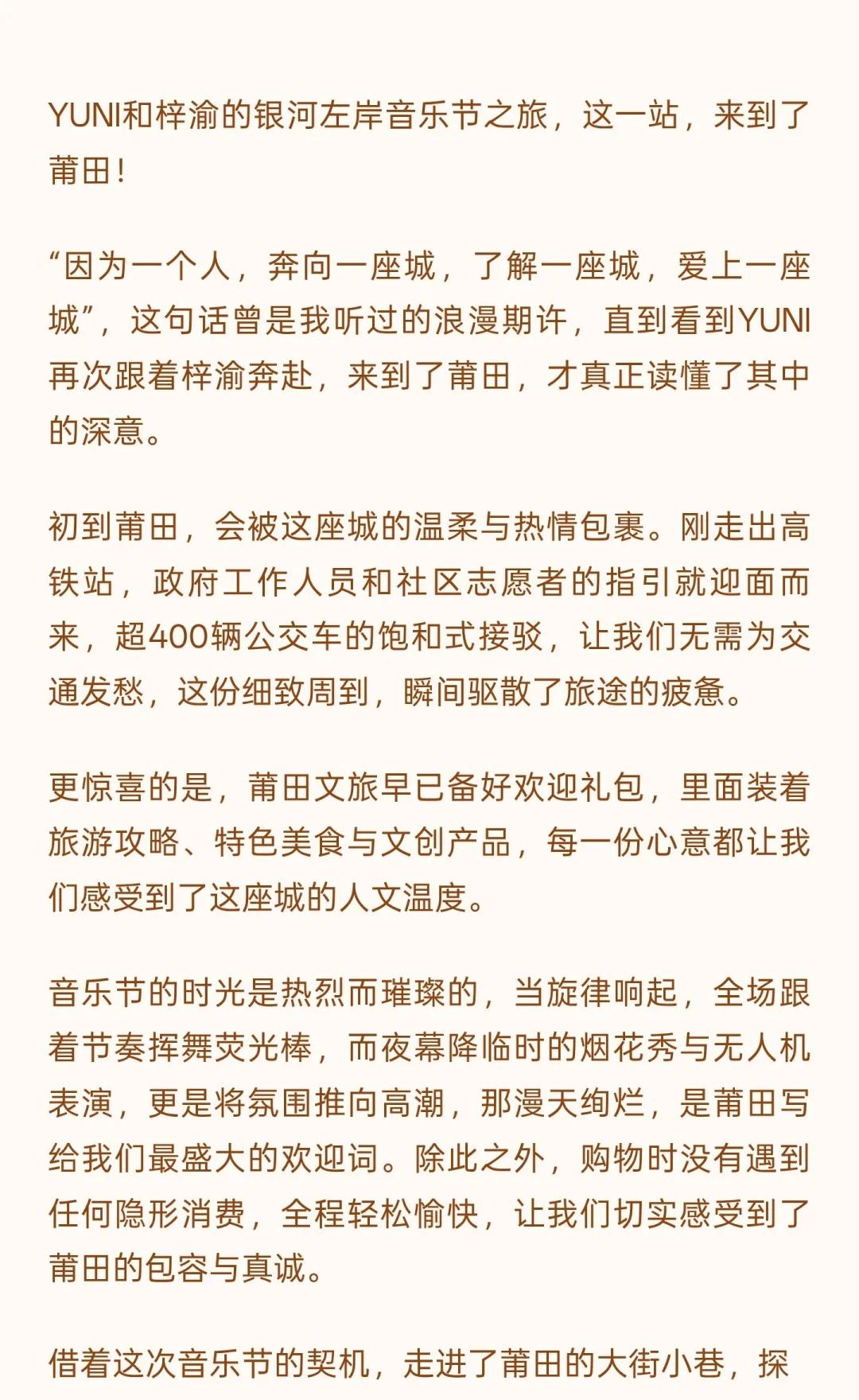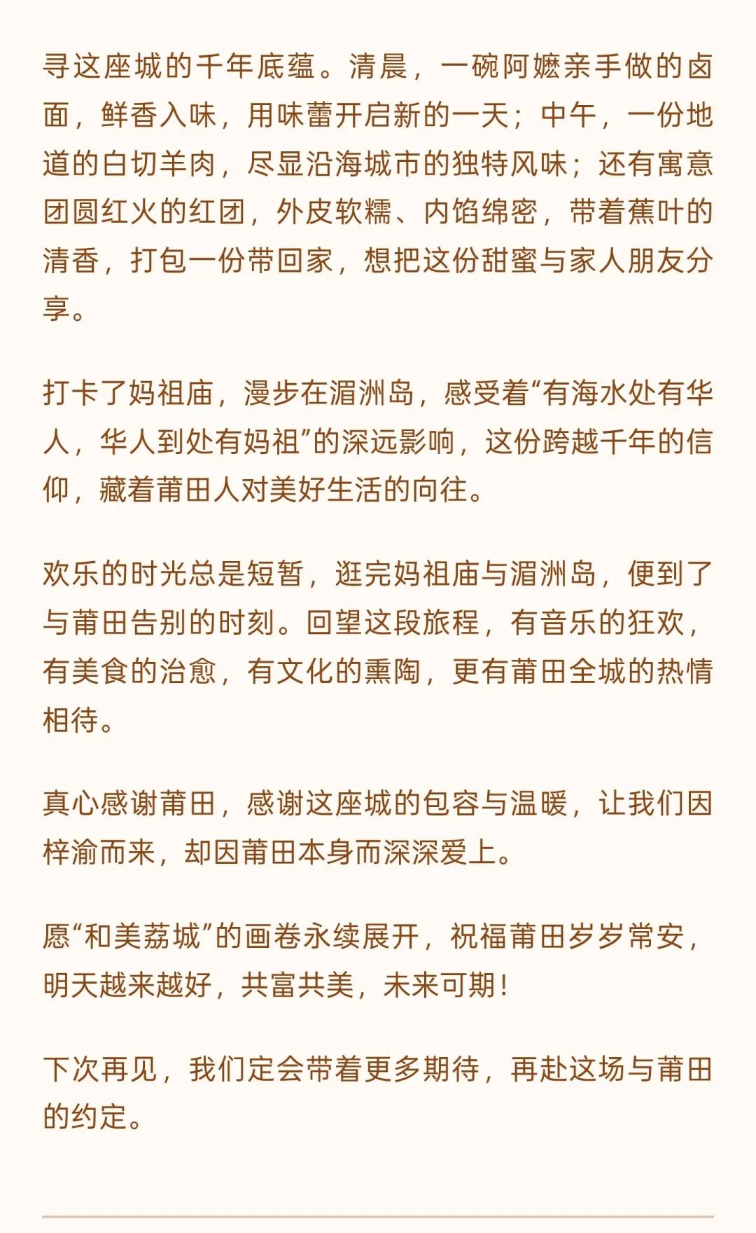 谢谢莆田,祝福莆田!! YUNI和梓渝在莆田的音乐节之旅中,感受到了这座城市的温柔与热情。从政府的细致接驳到文旅的贴心礼包,再到美食与文化的体验,莆田的包容与真诚让人印象深刻。期待再次与莆田相遇,共赴更多美好约定。梓渝 一切皆因爱 因为一个人爱上一座城
